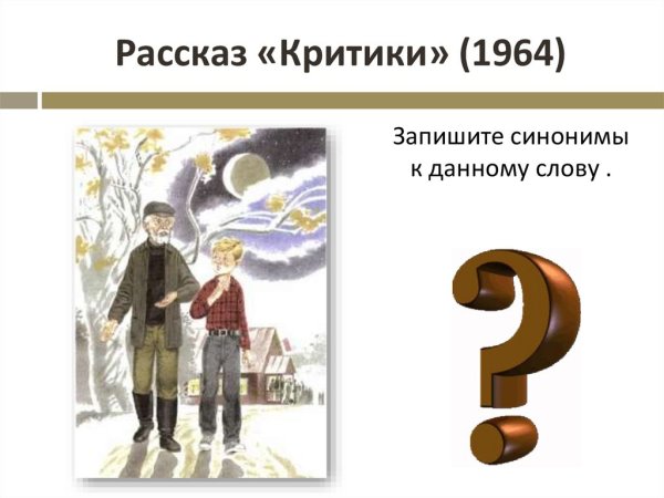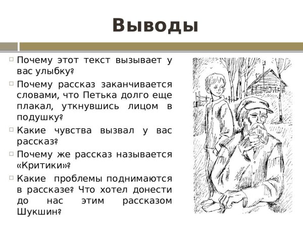 Иллюстрация к произведению Шукшина "Критики" является визуальным отображением главной темы и настроения этого литературного произведения. Она передает неповторимую атмосферу, наполненную сарказмом и иронией в адрес критиков и их несправедливых оценок. Изображение может быть выполнено в различных стилях и техниках, но всегда будет акцентировать внимание на конфликте между талантливым автором и бессознательными, некомпетентными критиками. Оно помогает читателю лучше понять основные идеи произведения и пережить эмоции, которые художник и писатель хотели вызвать у зрителя и читателя соответственно.