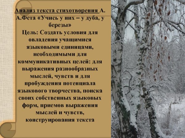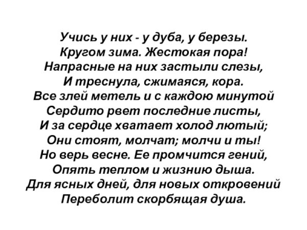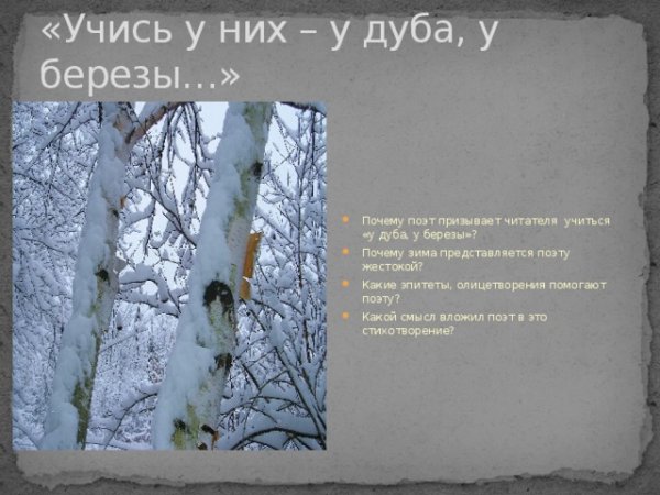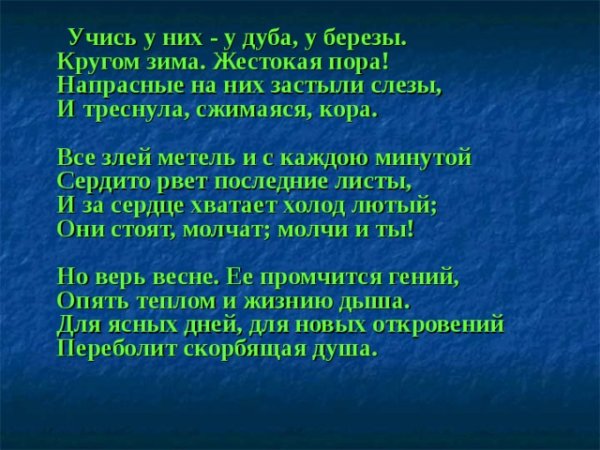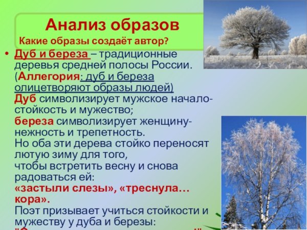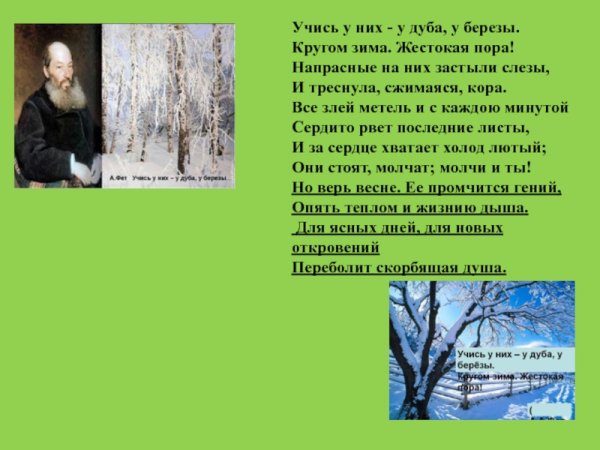 Иллюстрация к стиху "Учись у них - у дуба, у березы" является живописным отражением важности обучения и осмысленного роста, черпая знания и мудрость из природы. Могучий дуб символизирует силу и устойчивость, подсказывая нам о необходимости постоянного развития и укрепления своих знаний. Береза, своей легкостью и грацией, призывает нас быть гибкими и открытыми к новому, чтобы воспользоваться ценными уроками, которые природа предлагает нам. Путешествие к дубу и березе напоминает о том, что для достижения успеха и саморазвития нужно учиться у живых учителей, проникаясь их мудростью и опытом, а также приобретая ценные уроки, которые природа нам щедро дарит.