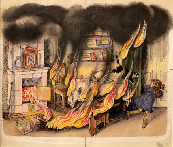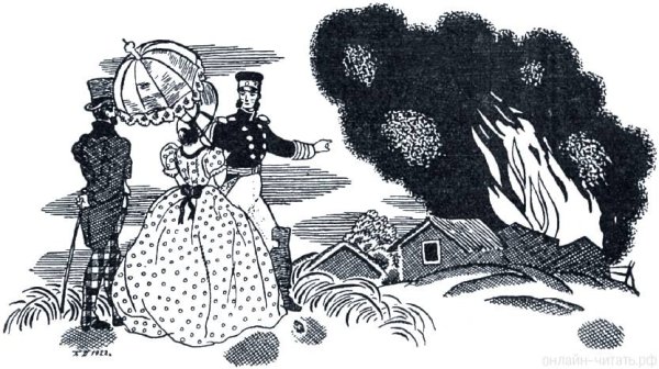 Иллюстрация к рассказу "Пожар" Льва Толстого воссоздает атмосферу напряженности и опасности, которая царит во время возгорания. Фоном служит ночное небо, озаренное пламенем, отражающимся в окнах высотных зданий. В центре изображения видно группу людей, суетящихся вокруг горящего дома, пытающихся спасти имущество и спаститься сами. Иллюстрация передает ощущение опасности и беспомощности, а также значительность и важность каждой секунды в такой ситуации. Она приковывает внимание зрителя и позволяет ему почувствовать настоящую тревогу и страх, которые охватывают всех участников происходящего.
