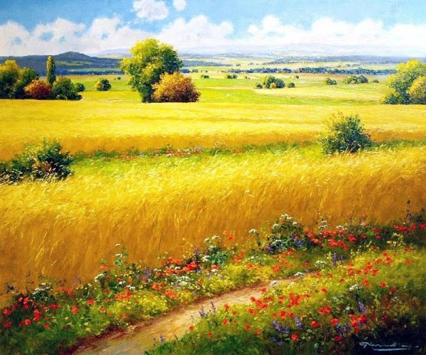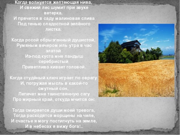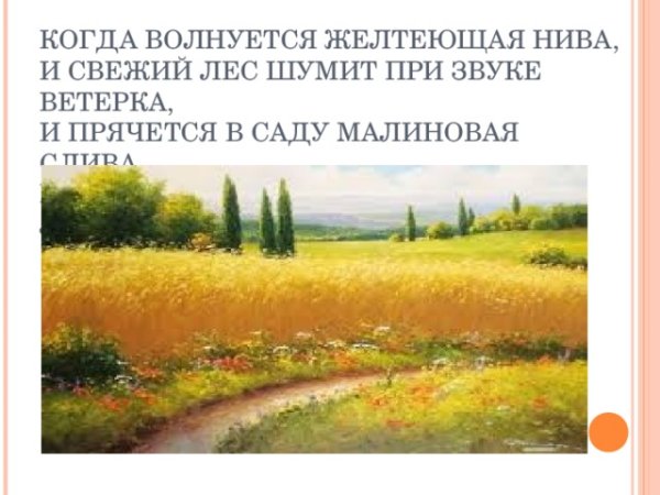 На фоне мягкого, желтеющего солнца, волны зеленой нивы медленно колышутся под легким дуновением ветра. Это изображение словно захватывает дух и переносит нас в красивый и спокойный мир природы. Вид света, отраженного на зрелом зерне, создает чувство гармонии и тепла. Желтеющая нива символизирует приближение осени, время урожая и благополучия. Очарование этого момента запечатлено в стихотворении, которое олицетворяет красоту и изменчивость природы, а также делает нас задуматься о скоротечности времени и наслаждении каждым прекрасным моментом.