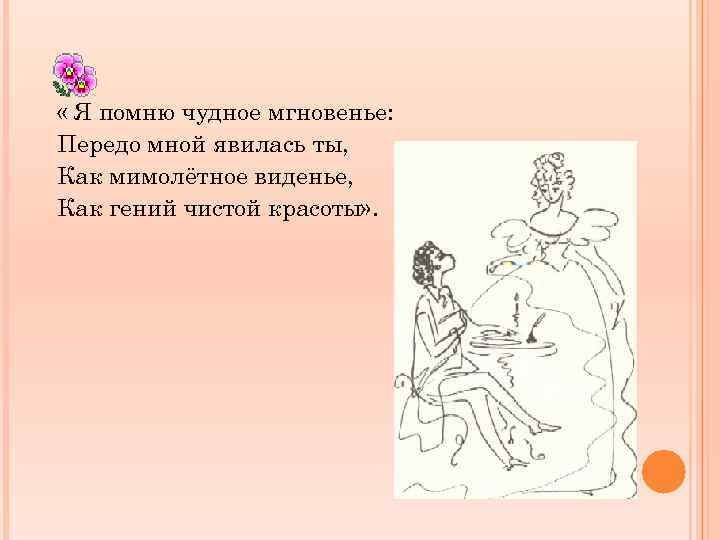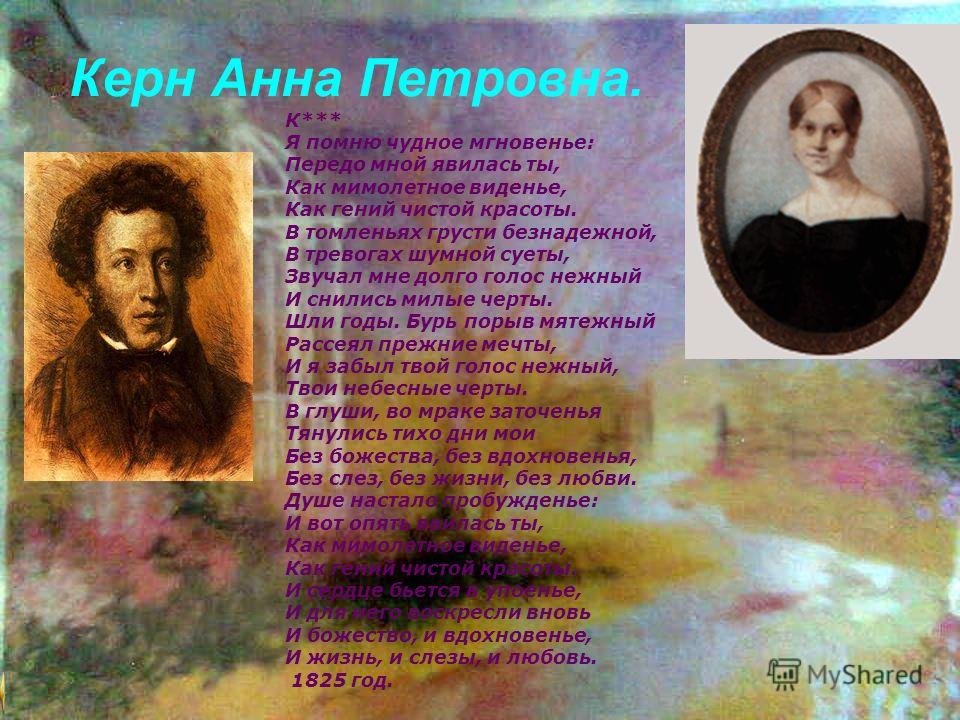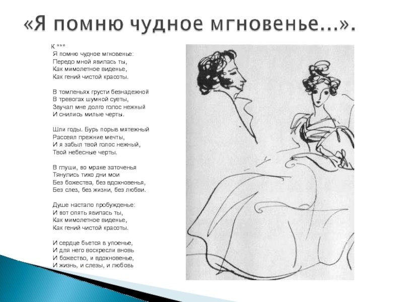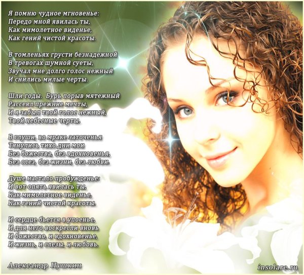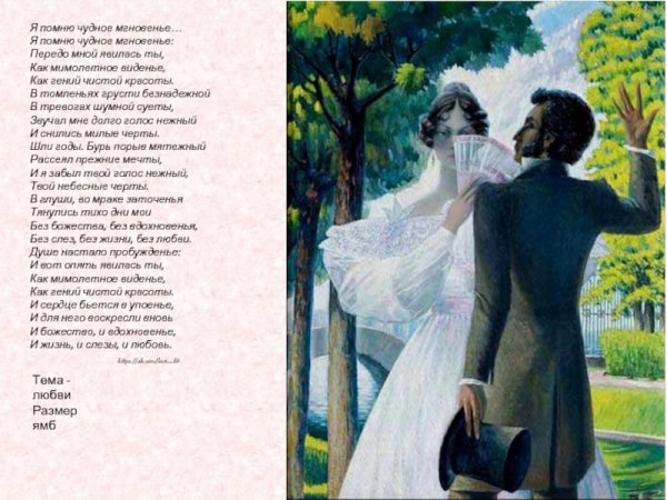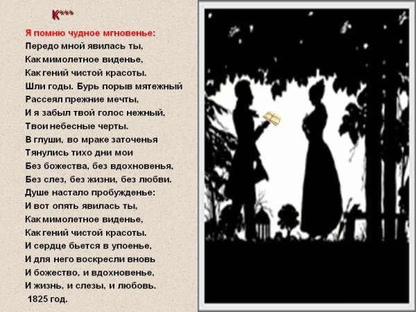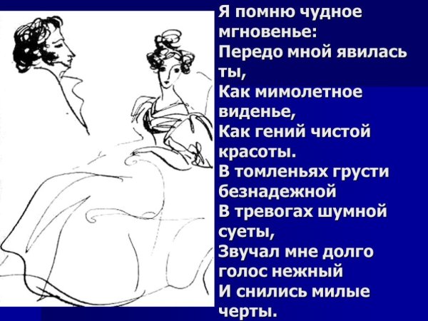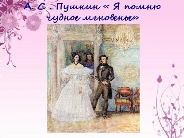 Иллюстрация к стихотворению "Я помню чудное мгновенье" является визуальным отображением замечательного и незабываемого момента, запечатленного в словах поэта. Она передает всю гамму эмоций и настроение, описанные в стихотворении. Возможно, это изображение пейзажа с прекрасным закатом или рассветом, которые символизируют мощную и неповторимую волну чувств и впечатлений, возникающих в душе лирического героя. Иллюстрация может быть наполнена яркими красками и живописными деталями, чтобы подчеркнуть великолепие и уникальность этого момента. Каждая линия и цвет на картине старательно передают всю глубину и интенсивность переживаний, вызванных этим мгновением. Иллюстрация к стихотворению "Я помню чудное мгновенье" является своеобразным прочтением стихотворения через образы и формы и позволяет зрителю еще глубже проникнуть в его смысл и эмоциональную составляющую.