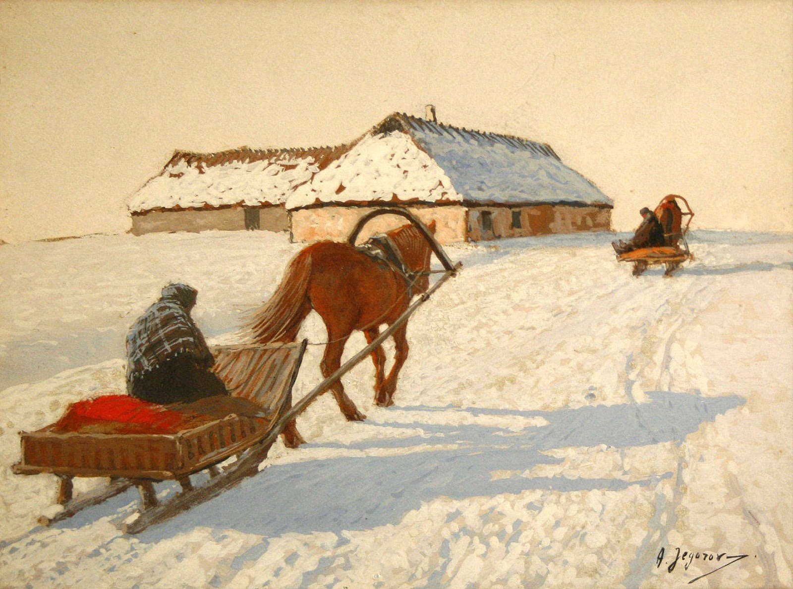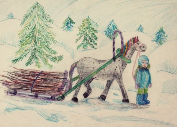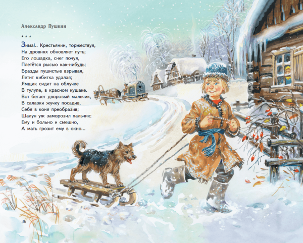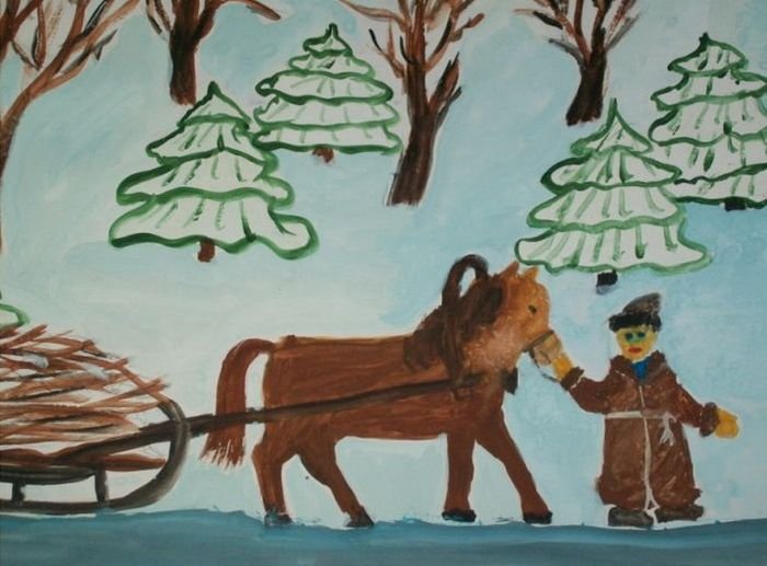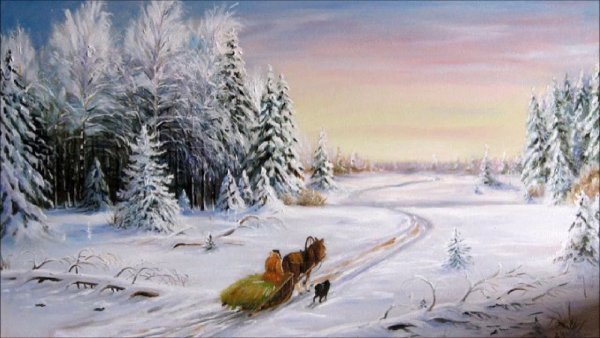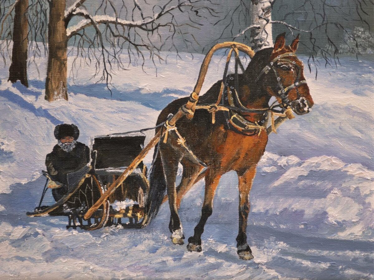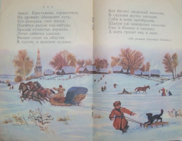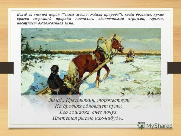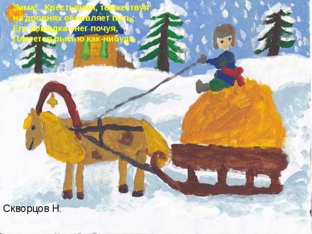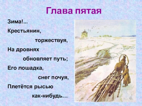 На иллюстрации к стиху "Зима крестьянин торжествуя" воплощена весьма живописная и яркая картина зимней сельской местности. Снежные поля и леса, испещренные покрышками свежего снега, создают ощущение спокойствия и умиротворения. Вдали виднеются крестьянские избы, дым которых клубится в небо, указывая на то, что рядом люди активно заняты повседневными хозяйственными делами. Закатное солнце придает картине теплую гамму и добавляет особой благодатной атмосферы. В общем, иллюстрация передает всю прелести зимней природы и жизни сельской общины в эту пору года, наполняя нас ощущением уюта и мирного существования.