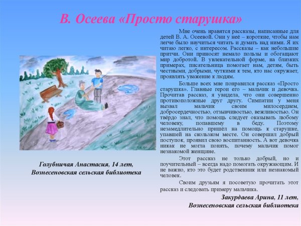 Иллюстрации к рассказам Осеевой – это настоящая жемчужина, которая дополняет и усиливает впечатление от чтения произведений этой талантливой писательницы. Каждая иллюстрация ярко раскрывает сюжет и персонажей рассказов, заставляя читателя глубже вжиться в мир, созданный Осеевой. Старушка, ставшая главной героиней нескольких рассказов, олицетворяет мудрость, силу духа и выдержку. Иллюстрации к ним помогают передать атмосферу времени и места, позволяя читателю окунуться в атмосферу произведения и полностью погрузиться в его сюжетную линию. Благодаря этим иллюстрациям, рассказы Осеевой становятся ещё более яркими и запоминающимися, заставляя восхищаться талантом писательницы и внимательно следить за каждым поворотом событий.