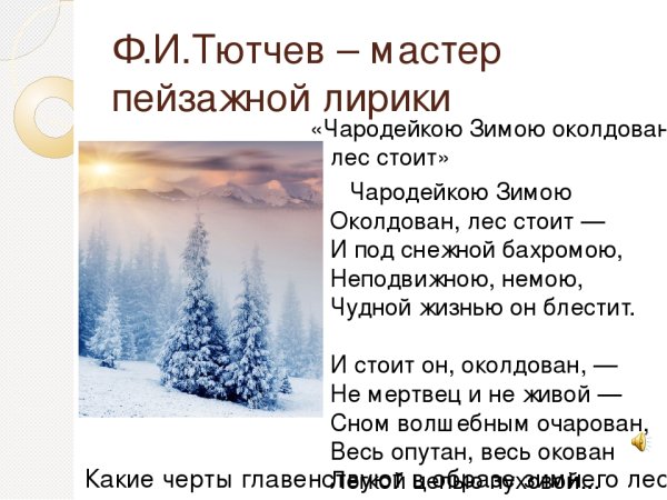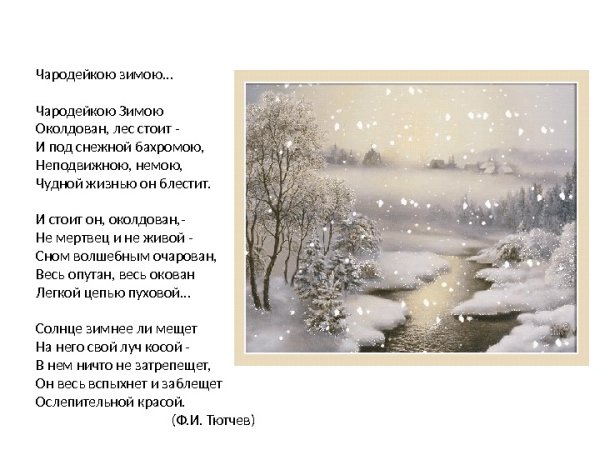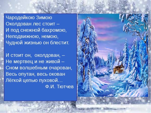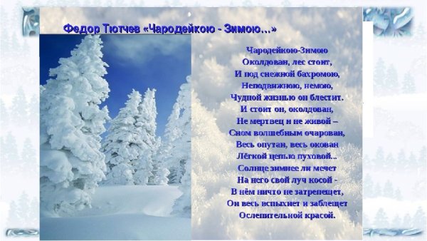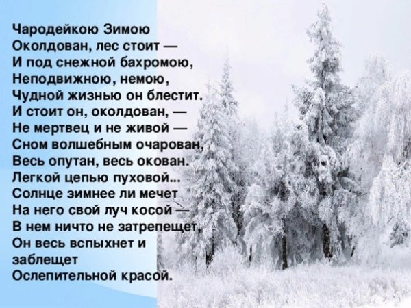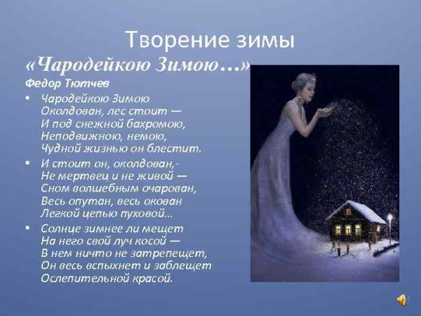 Иллюстрация к стиху "Чародейкою зимою" Тютчева - это визуальное отображение магической и красочной зимней атмосферы, которую описывает поэт. В этом стихотворении автор передает свое восхищение и умиление перед природным явлением зимы. Иллюстрация может изображать снежные пейзажи, покрытые белым пушистым снегом, листвой деревьев, на которой лежит тонкий слой инея, и прозрачный голубой небосвод, украшенный сияющими звездами. Через иллюстрацию можно передать все волшебство зимы, ее тишину и спокойствие, создавая атмосферу умиротворения и величия природы. Визуальное представление стихотворения помогает раскрыть его эмоциональную глубину и заставляет зрителя или читателя погрузиться в атмосферу холодной, но в то же время прекрасной зимы.