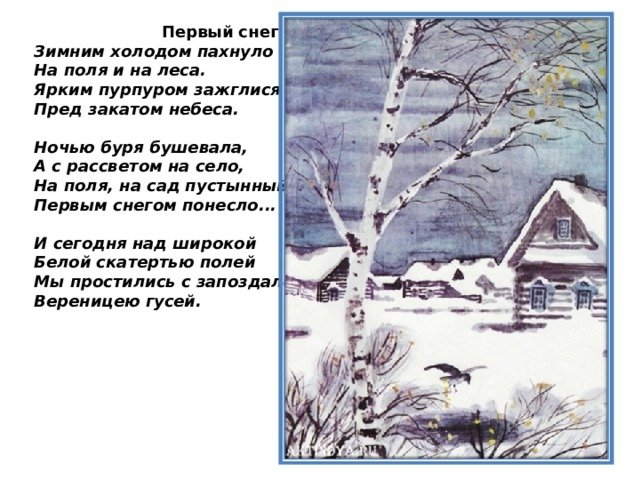 Иллюстрация к стихотворению "Первый снег" И.А. Бунина была создана с невероятной тонкостью и чувственностью, передавая атмосферу первого снегопада. На картине можно увидеть зимний пейзаж, где белоснежные хлопья медленно падают на землю, окутывая все вокруг своими легкими шелковистыми прикосновениями. Воздух наполнен тишиной и спокойствием, словно время замерло в ожидании волшебного пробуждения природы. Иллюстрация передает не только визуальное восприятие снегопада, но и эмоциональную составляющую - радость и восторг, вызванные приближением зимы и изменением ландшафта. Она заставляет зрителя почувствовать всю красоту и неповторимость этого момента, оставаясь одновременно нежным и магическим.
