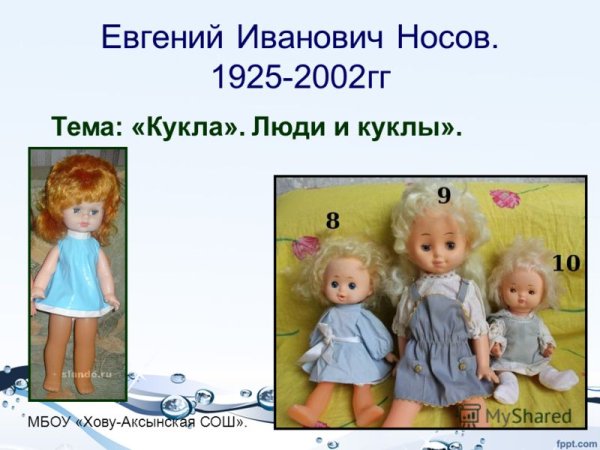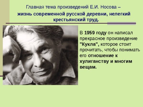 Евгений Иванович Носов - известный советский детский писатель, автор таких замечательных произведений, как "Кукла" и "Иллюстрации". В своих книгах Носов создает удивительный мир, полный приключений и веселья, который притягивает внимание детей и взрослых. "Кукла" - это захватывающий рассказ о том, как обычная кукла оживает и становится верным другом для главной героини. А "Иллюстрации" - это волшебная история, где главные герои путешествуют по страницам книг и общаются с персонажами из разных иллюстраций. Книги Евгения Носова яркие, запоминающиеся и позволяют маленьким читателям окунуться в волшебный мир фантазии и воображения.