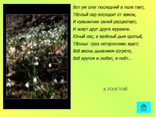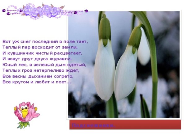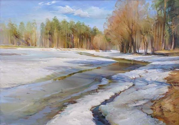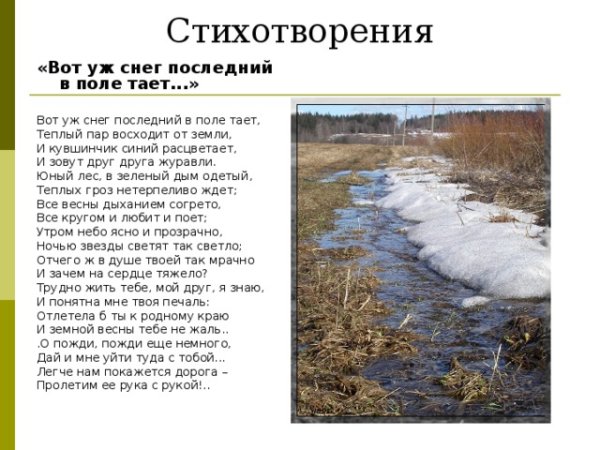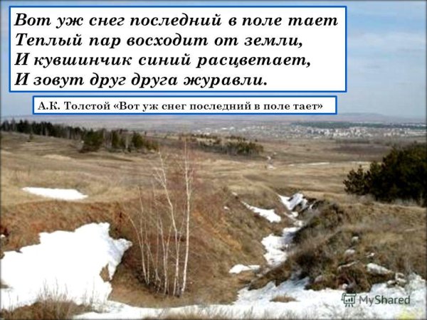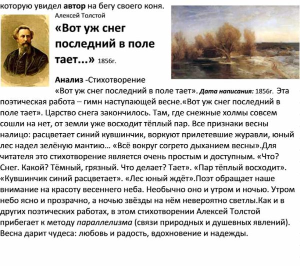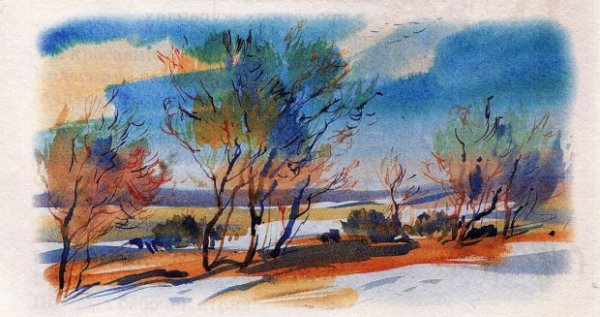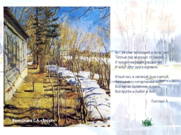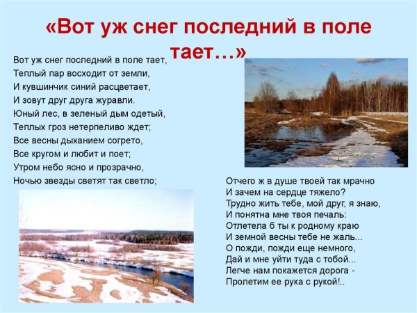 Иллюстрация к стиху "вот уж снег последний в поле тает" может быть нежное и меланхоличное изображение. На нем можно показать пушистые снежинки, растаявший снег и прозрачную воду, которая образует небольшие лужи на земле. Возможно, в фоне будет виден распускающийся весенний лес или одинокое дерево, символизирующее переход от зимы к весне. Цветовая гамма может быть пастельной, с использованием белых, серых и нежных оттенков голубого. Иллюстрация должна передавать атмосферу прощания со зимой и ожидания прихода весны, создавая особую эмоциональную подоплеку для стихотворения.