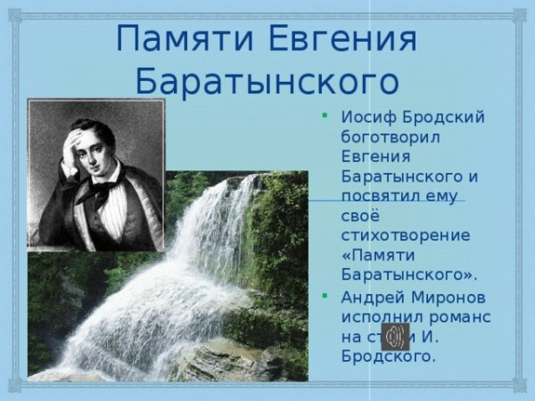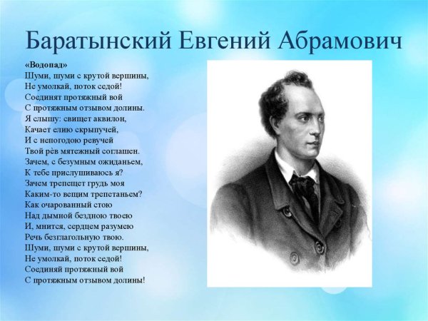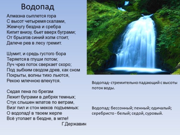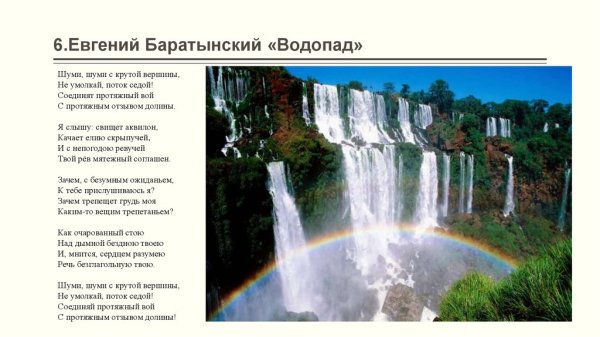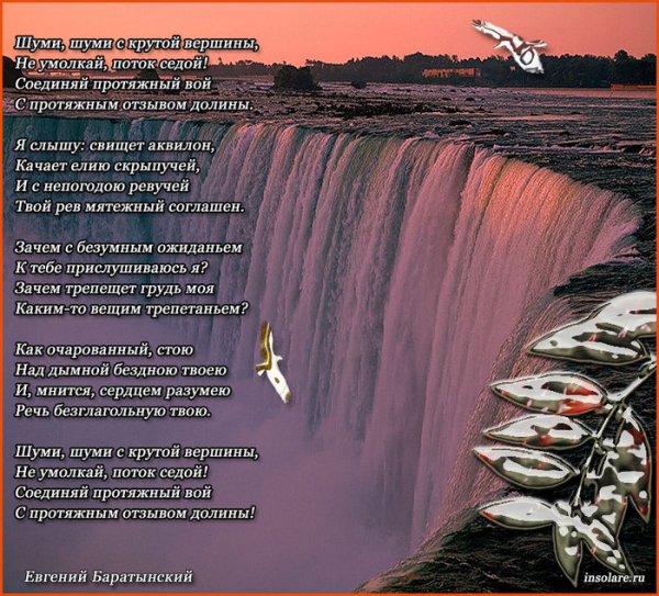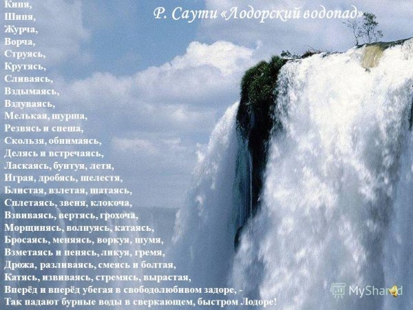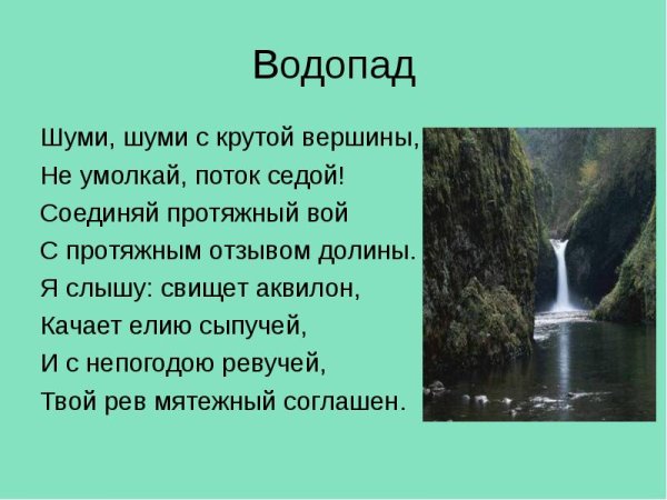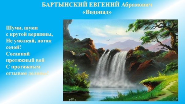 Иллюстрация к стиху баратынского "Водопад" является визуальным отражением мощи и красоты природы, переданной поэтом в своем произведении. Она позволяет зрителю увидеть и почувствовать все те эмоции и впечатления, которые описываются в стихотворении. Изображение водопада может быть ярким и динамичным, с излиянием воды, создающей капли и брызги воздуха. Оно может также передать грандиозность и величие природного феномена, вызывая у зрителя чувство благоговения перед могуществом природы. В целом, иллюстрация к стиху "Водопад" Баратынского должна быть яркой, эмоциональной и способной перенести зрителя в мир невероятной природной красоты и силы.