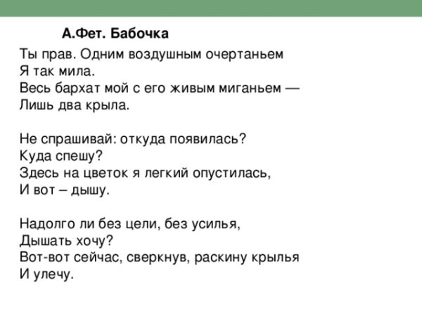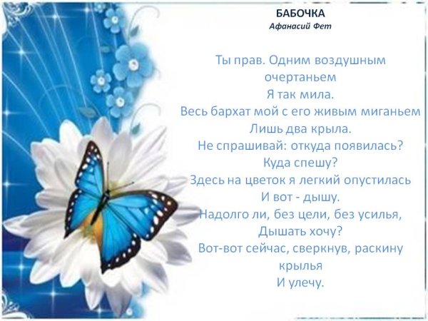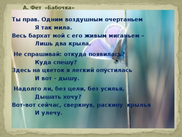 Афанасий Афанасьевич Фет - известный русский поэт XIX века, автор множества лирических произведений, которые до сих пор остаются популярными. Одним из его замечательных произведений является стихотворение "Бабочка". В нем поэт описывает красочного и нежного насекомого, свободно парящего в воздухе и притягивающего взгляды своей изящностью. Иллюстрации, созданные Фетом к своему произведению, воссоздают эту уникальную атмосферу и придают еще большую глубину и выразительность тексту. Через живописные образы бабочки и ее движений поэт передает свои эмоции и чувства, перенося читателя в мир легкости и красоты природы. Эти иллюстрации являются неотъемлемой частью произведения и помогают в полной мере погрузиться в философию и художественную концепцию стихотворения "Бабочка".