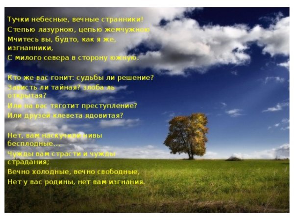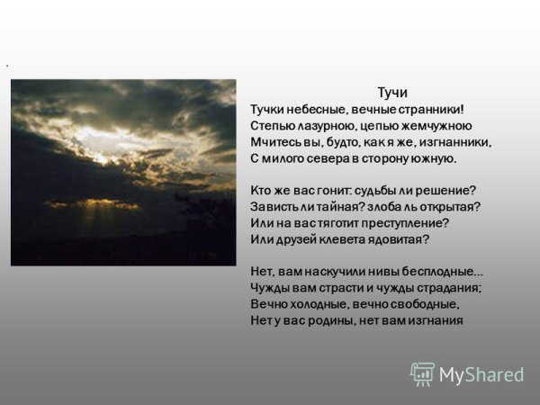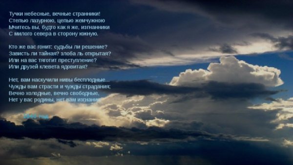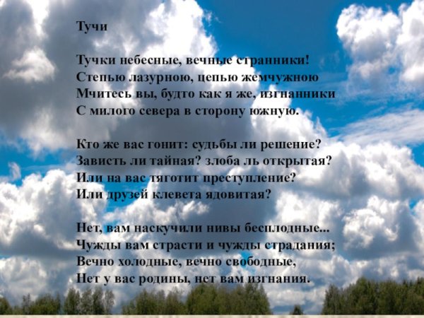 Иллюстрация к стиху "тучки небесные" позволяет передать атмосферу загадочности и красоты природы. Нежные, пушистые облака, плывущие на голубом небе, создают ощущение легкости и спокойствия. Их формы и оттенки могут быть самыми разнообразными - от мягких белых до темных и угрожающих. В зависимости от контекста стихотворения, иллюстрация может подчеркивать лиричность, романтику или даже драматичность произведения. Такая визуализация помогает читателю в полной мере ощутить эмоциональную силу и глубину текста и погрузиться в его мир.