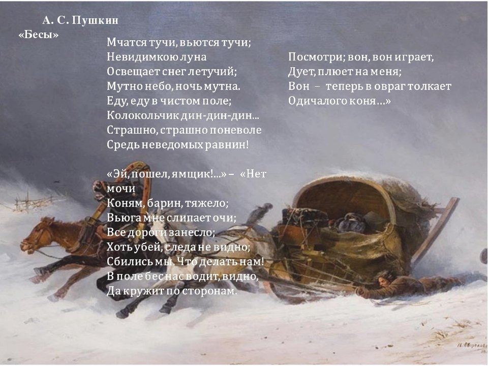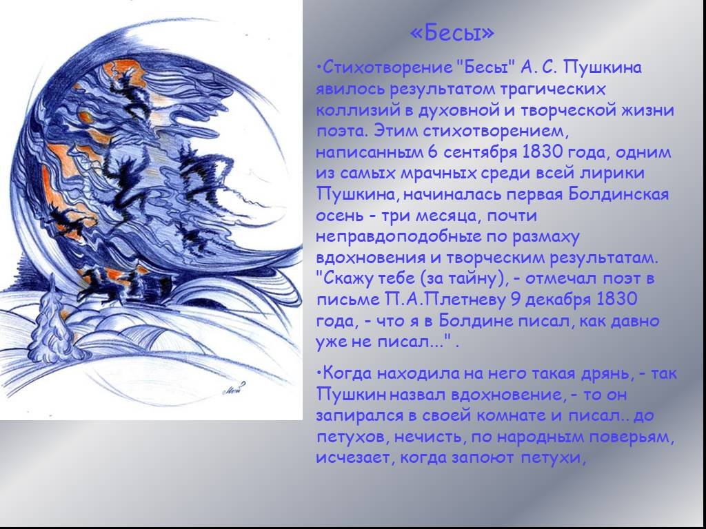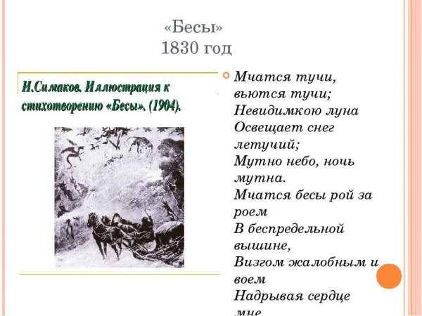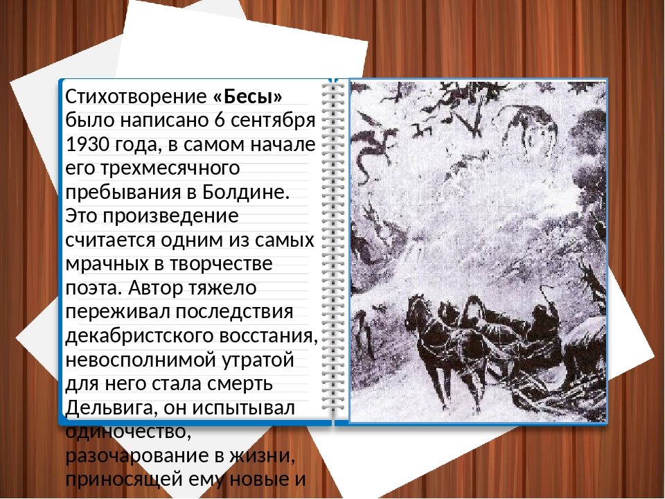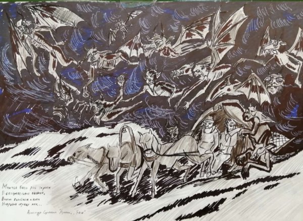Иллюстрация к стихотворению "Бесы" Александра Пушкина является визуальным представлением мрачной и загадочной атмосферы произведения. Она позволяет зрителю окунуться в мир духовных сил, олицетворяющих непоколебимость зла и его влияние на человеческую жизнь. Используя технику реалистического изображения или же символические элементы, иллюстратор передает не только внешний образ бесов, но и их внутреннюю сущность, пробуждая у читателя чувство тревоги и беспокойства. Каждая деталь иллюстрации, будь то выражение лица, поза или декоративные элементы, служит для подчеркивания главных идей стихотворения, раскрывая его глубинный смысл и отражая душевное состояние персонажей. Такая иллюстрация создает эмоциональную связь с текстом и помогает читателю лучше понять и ощутить всю глубину и силу произведения "Бесы".