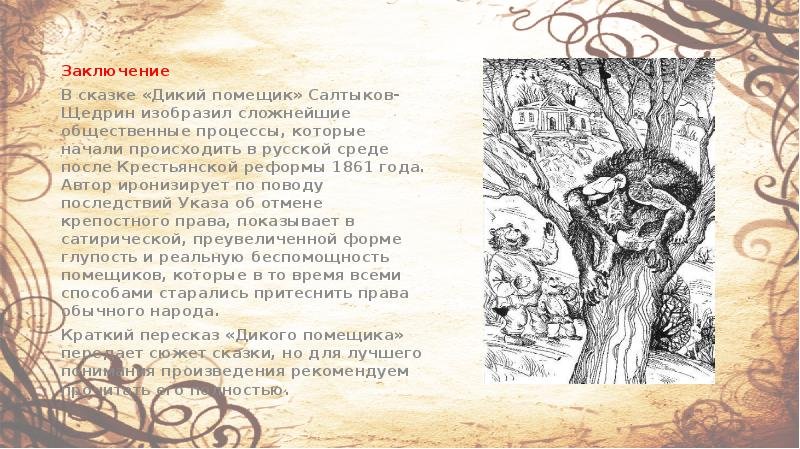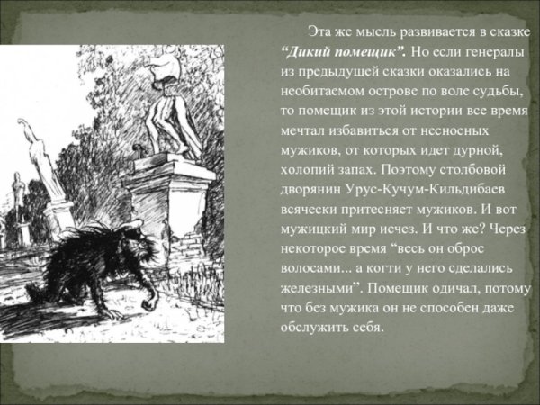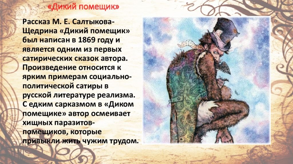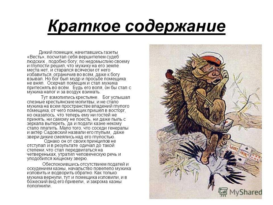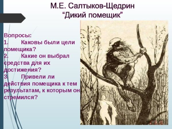 В произведении Н. В. Гоголя "Диковинные истории" есть одна из самых знаменитых повестей - "Сказка о том, как один дикарь двух помещиков прокормил". В этой истории автор рассказывает о событиях, связанных с действиями дикого помещика. Он описывает характер и поступки этого человека, который живет в отдаленной деревне и ведет себя необычно для общества своего времени. Диковинные поступки главного героя вызывают различные реакции у его окружения, что делает историю интересной и запоминающейся. Салтыков-Щедрин изображает типичного представителя русской помещичьей элиты, и в своей работе подвергает критике нравы и обычаи этого класса. Через призму героя и его поступков, автор задает вопросы о нравственности, социальной справедливости и неразумных привычках русского дворянства. В результате получается портрет типичного дикого помещика, который становится символом корысти и безразличия к жизни других людей.