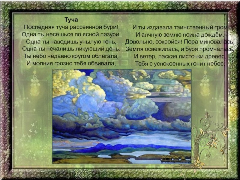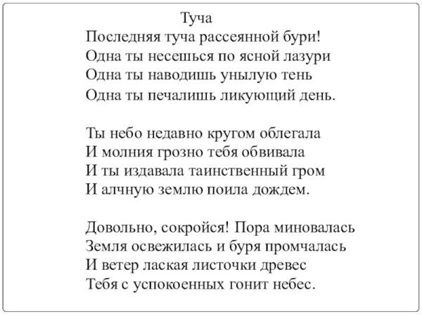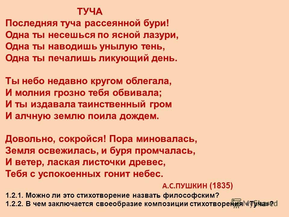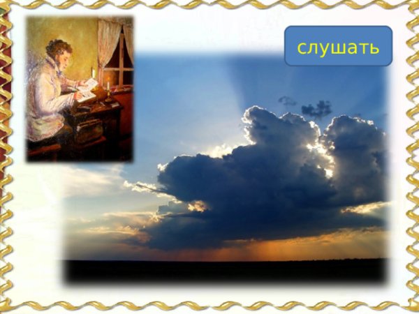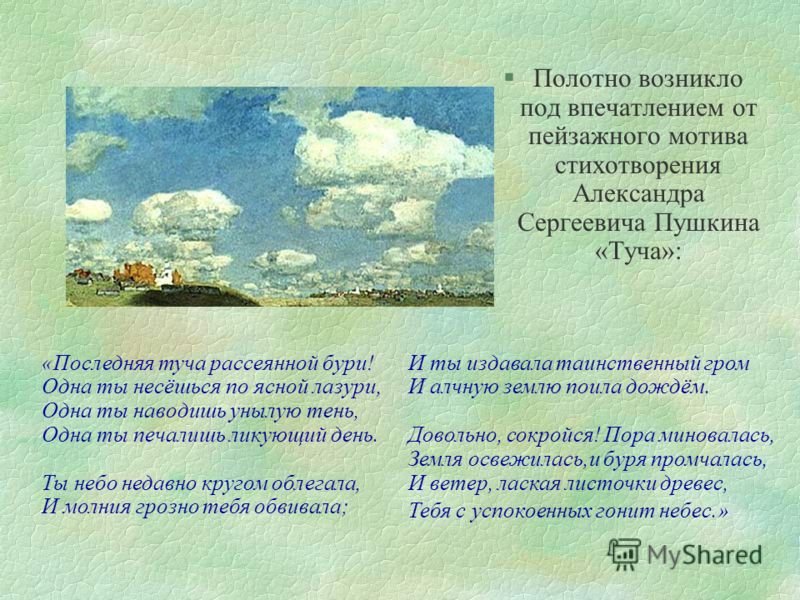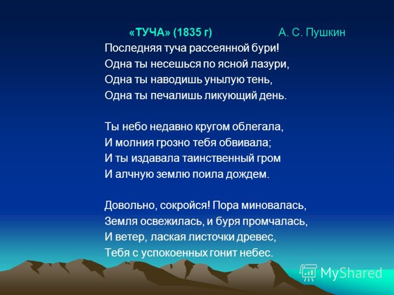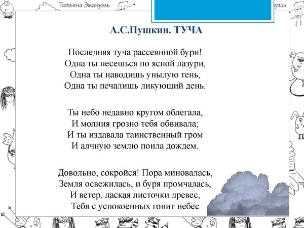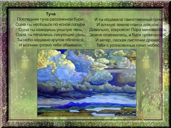 Великий русский поэт Александр Сергеевич Пушкин в своих стихотворениях умело использовал образы и метафоры для передачи своего внутреннего мира. В одном из его стихотворений он описывает тучу, которая символизирует не только природные явления, но и эмоциональное состояние. Иллюстрация к этому стиху позволяет нам визуально представить этот образ и почувствовать атмосферу, созданную словами Пушкина. Темная и густая туча на небосклоне может передать непредсказуемость и тайны, скрытые внутри человеческой души. Она вызывает смешанные чувства, отражая настроение и мысли автора. Иллюстрация к этому стиху позволяет зрителю проникнуться глубиной и значимостью каждого слова, сделав опыт чтения стихотворения более визуальным и эмоциональным.