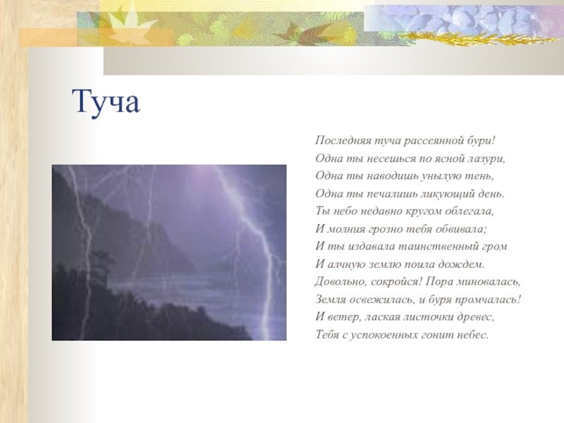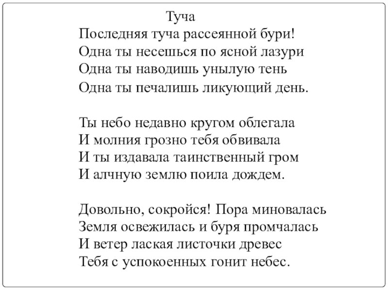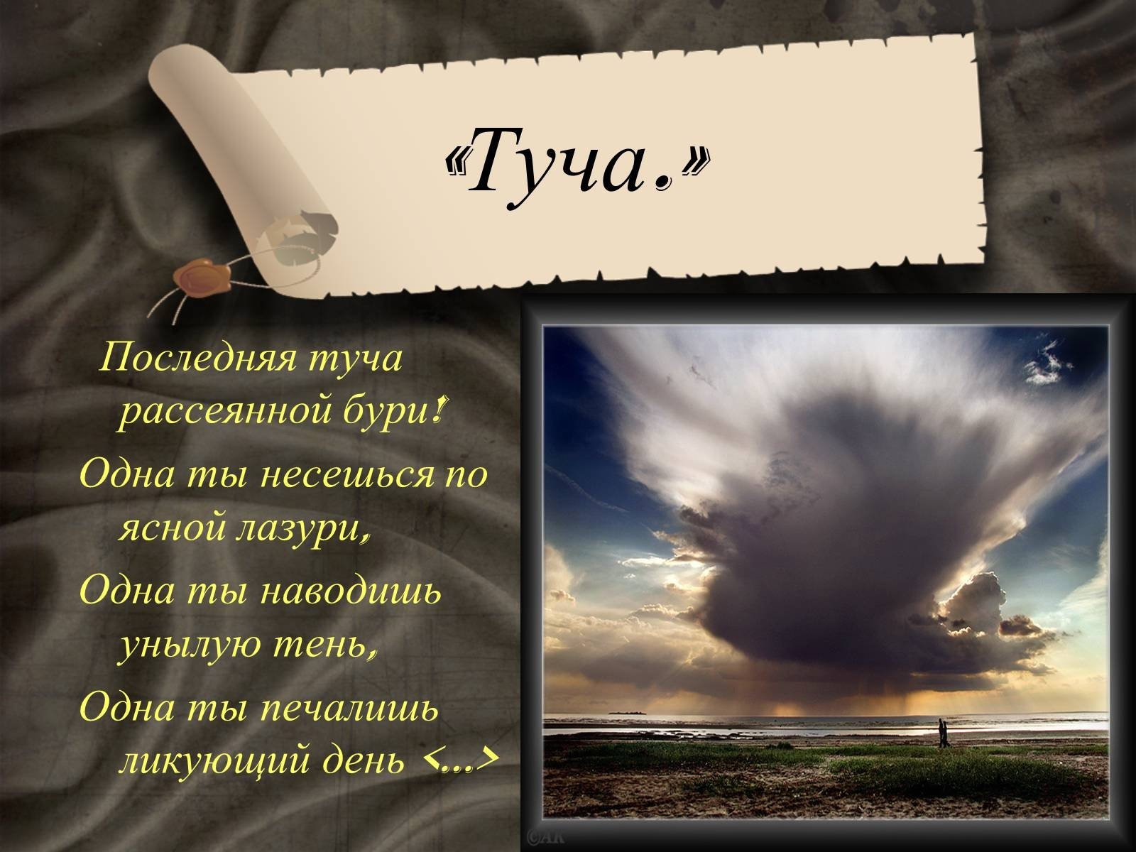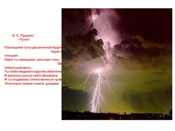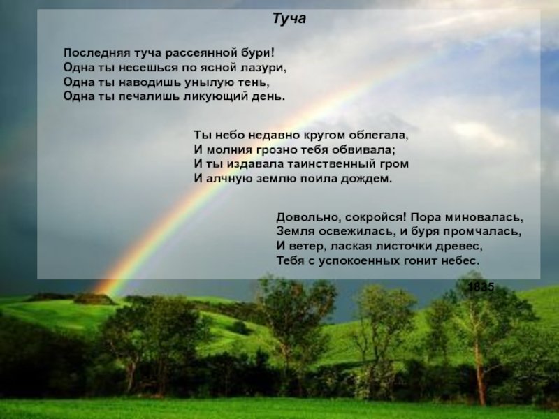Великий русский поэт Александр Сергеевич Пушкин в своих стихотворениях умело использовал образы и метафоры для передачи своего внутреннего мира. В одном из его стихотворений он описывает тучу, которая символизирует не только природные явления, но и эмоциональное состояние. Иллюстрация к этому стиху позволяет нам визуально представить этот образ и почувствовать атмосферу, созданную словами Пушкина. Темная и густая туча на небосклоне может передать непредсказуемость и тайны, скрытые внутри человеческой души. Она вызывает смешанные чувства, отражая настроение и мысли автора. Иллюстрация к этому стиху позволяет зрителю проникнуться глубиной и значимостью каждого слова, сделав опыт чтения стихотворения более визуальным и эмоциональным.