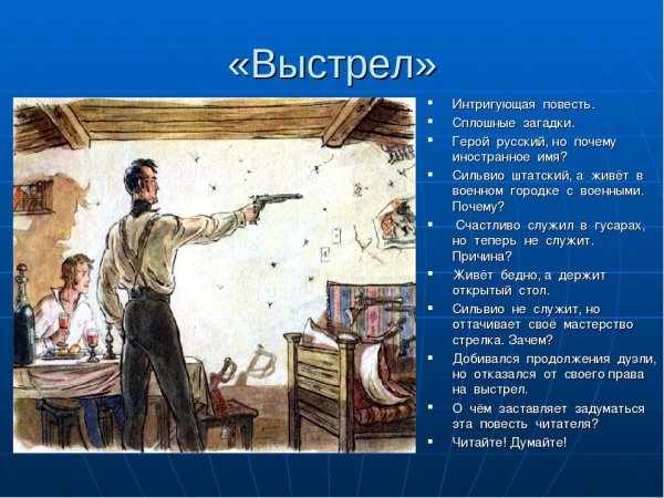 Иллюстрация к произведению "Выстрел" Александра Сергеевича Пушкина дает возможность взглянуть на этот знаменитый рассказ с новой, визуальной стороны. Она помогает передать атмосферу и напряжение момента, описываемого автором. Иллюстрация может воплощать сцены из рассказа, отображая главных героев, их эмоции и окружающую обстановку. Она позволяет читателю еще глубже погрузиться в сюжет и почувствовать настоящую интригу и драматичность произведения. Каждый элемент иллюстрации тщательно подобран, чтобы точно передать настроение и события, происходящие в тексте. Таким образом, иллюстрация к произведению "Выстрел" Александра Сергеевича Пушкина полностью соответствует его богатой атмосфере и помогает читателю воспринять его содержание с новой, увлекательной стороны.