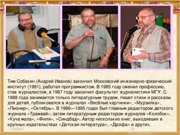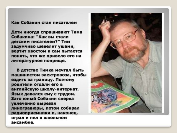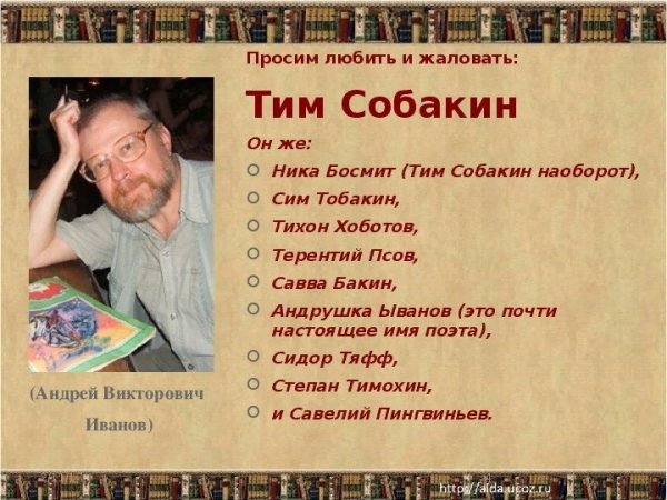 Тим Собакин - талантливый автор, который великолепно сочетает стихи и иллюстрации. Его работы пронизаны глубокими эмоциями и позволяют читателю окунуться в мир фантазии и воображения. Каждое стихотворение Тима наполнено яркими образами и красочными описаниями, а его иллюстрации умеют очаровывать и захватывать взгляд. Он способен создавать настроение и передавать свои мысли через каждую строчку и каждую линию рисунка. Если вы ищете поэтические произведения, оживленные потрясающими иллюстрациями, то Тим Собакин - именно то, что вам нужно.