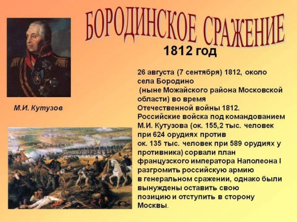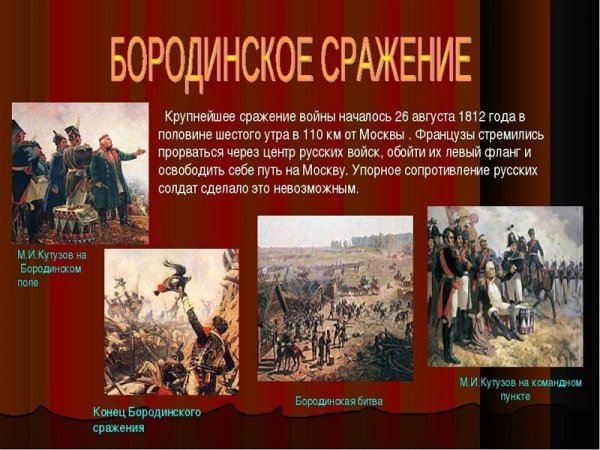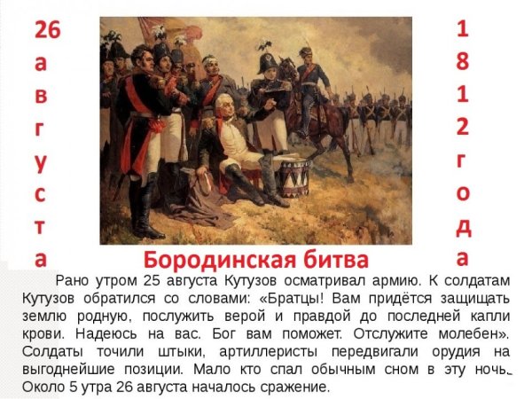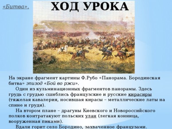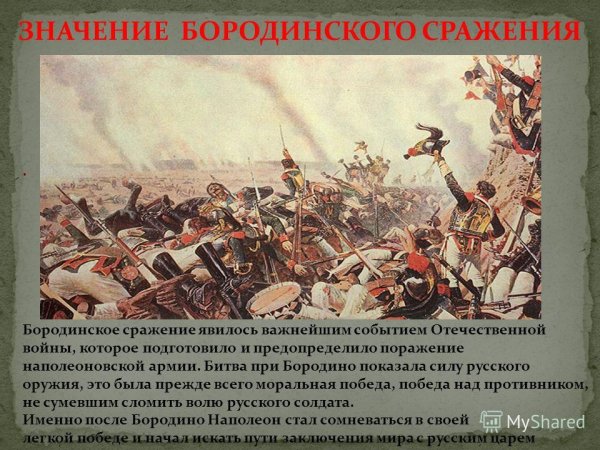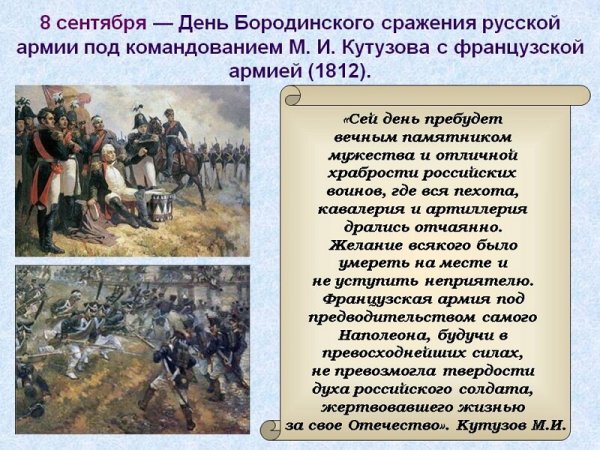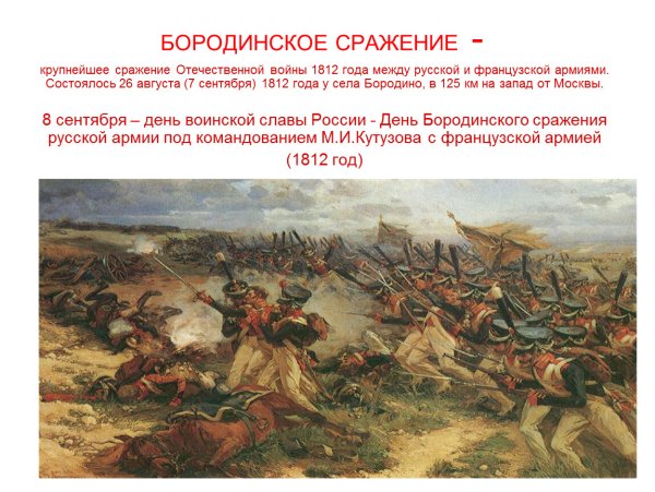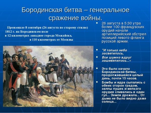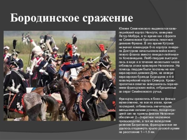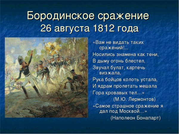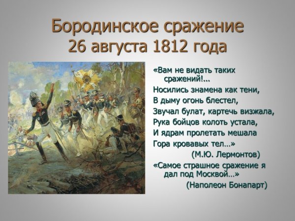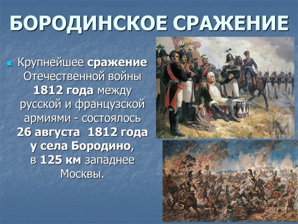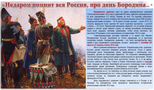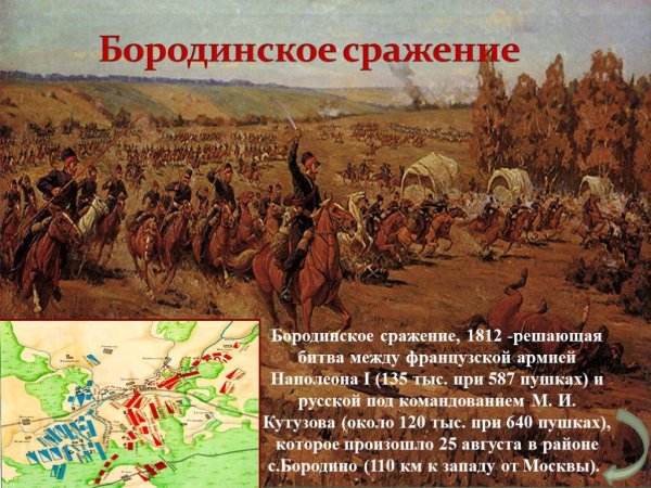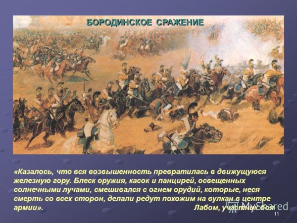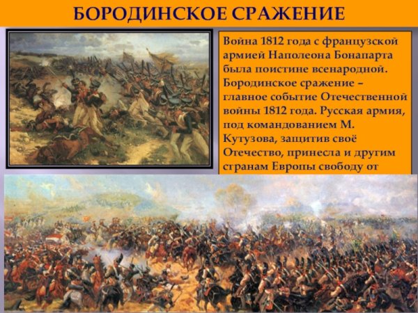Бородинская битва - одно из самых значимых сражений в истории России, которое произошло 7 сентября 1812 года. Это столкновение между российской армией под командованием Михаила Кутузова и грандиозной французской армией Наполеона Бонапарта оставило непередаваемый след в сердцах людей и на страницах истории. Иллюстрация этого события наглядно передает масштабность и напряженность битвы: линии солдат, оснащенных мушкетами и саблями, уверенно противостоят друг другу, колесницы и кони скакунов создают атмосферу динамики и движения. Весь этот образ характеризуется силой, мужеством и героизмом, которые олицетворяли и русские, и французы во время этой исторической битвы.