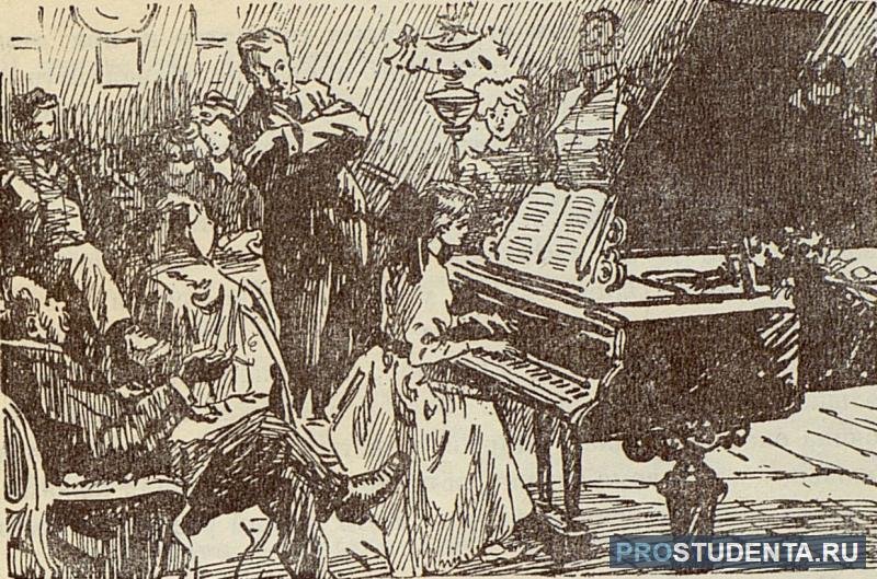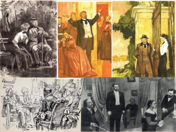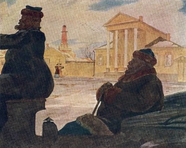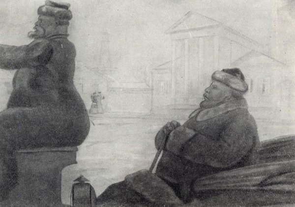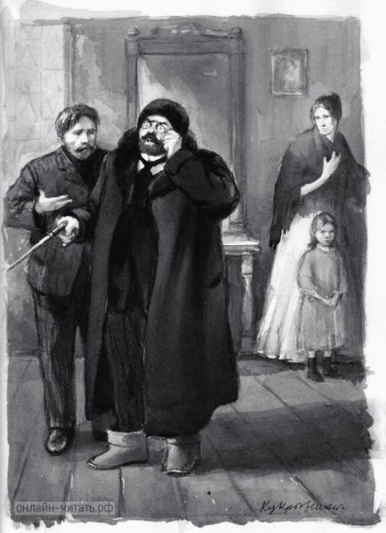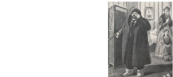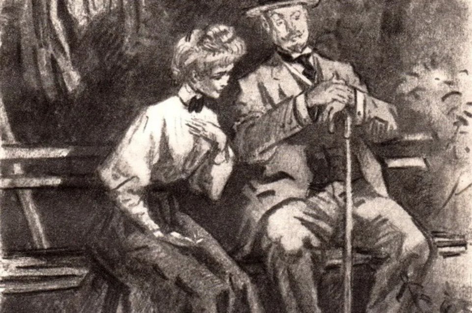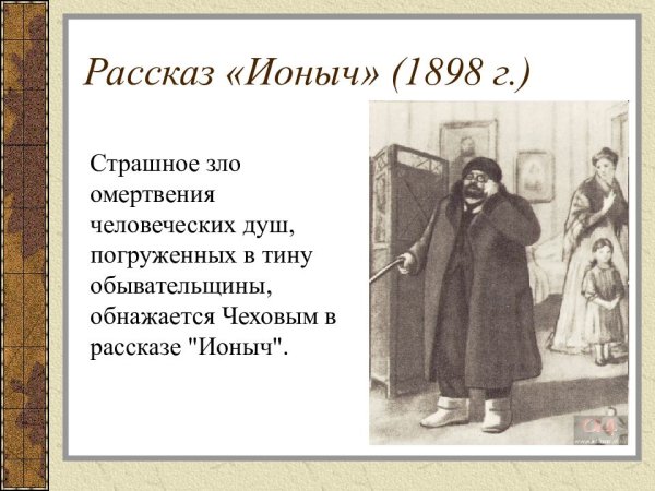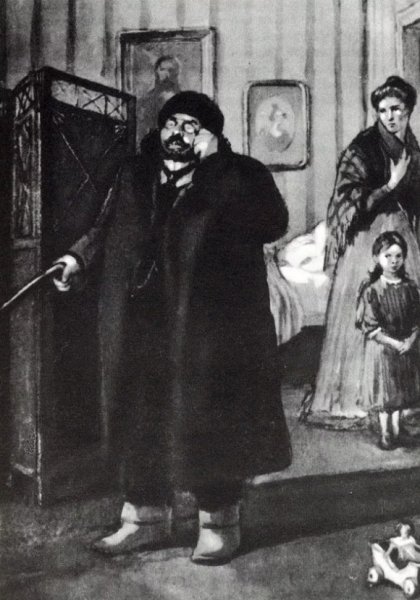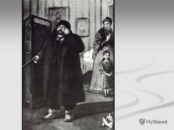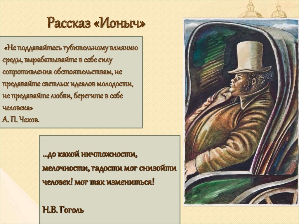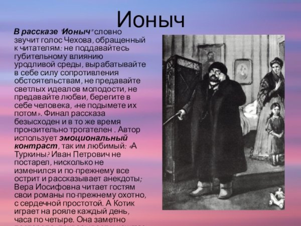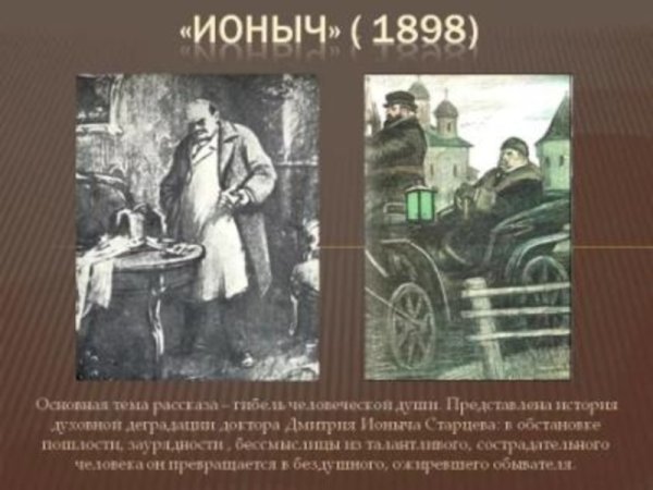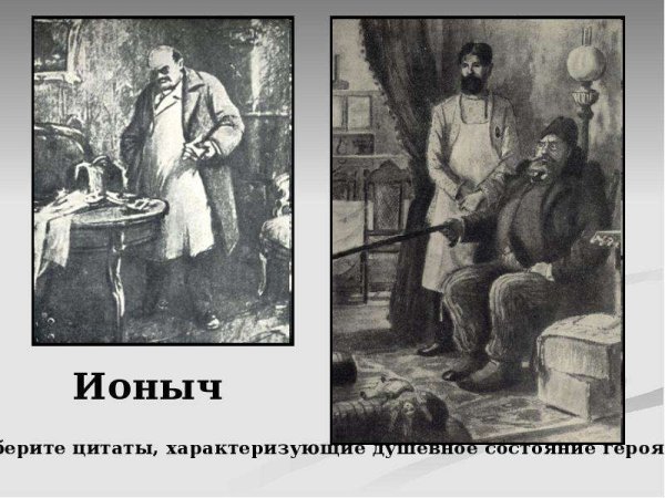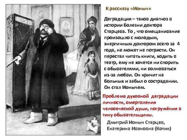В данной иллюстрации представлен рассказ "Ионыч" Антона Чехова. На ней изображено событие, происходящее в самом начале повествования, когда главный герой, молодой врач Иван Дмитриевич Шпехт, приезжает в провинциальный городок и знакомится с новыми коллегами. На иллюстрации можно увидеть Ивана Дмитриевича, одетого в темный костюм, с дипломатической портфельчиком в руках, стоящего перед входом в больницу, за которым виднеются другие персонажи - медицинский персонал и пациенты. Образ Ивана Дмитриевича выражает некую тревожность и чувство ожидания, что отражает его волнение перед новым этапом его карьеры и жизни. Эта иллюстрация является визуальным образом, который помогает воссоздать атмосферу и настроение рассказа.