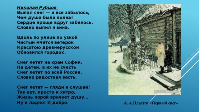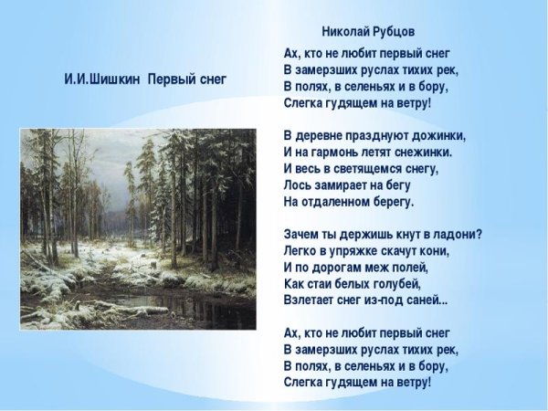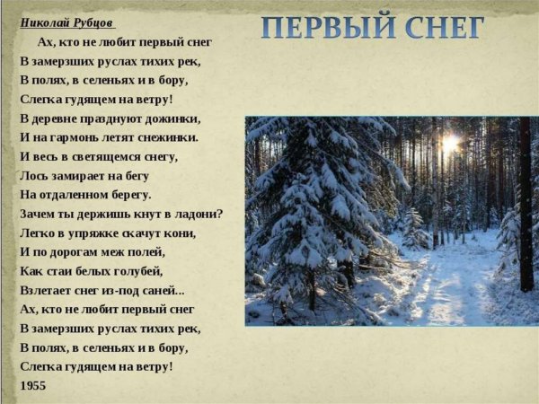 Иллюстрация к стиху "Первый снег" Рубцова - это нежное и волшебное изображение зимнего пейзажа, которое переносит нас в мир детства и радости. На картине можно увидеть белоснежные сугробы, покрытые сверкающими кристаллами снега, которые отражают игривые лучи солнца. Вдалеке виднеется тихая река, покрытая тонким слоем льда. Ощущается атмосфера тепла и уюта, вызывающая желание скользить по замерзшему пруду на коньках или строить снежных гномиков и снежные форты. Эта иллюстрация передает всю красоту и чистоту первого снега, запечатлевая момент, который остается в памяти навсегда.