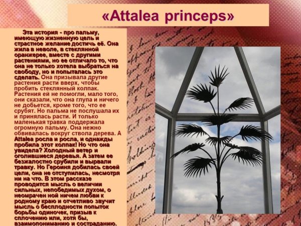 Иллюстрация к рассказу "Аталия принцепс" является визуальным отражением истории, написанной с искренним вдохновением и глубоким пониманием человеческой природы. Этот рассказ о молодой принцессе Аталии, которая сталкивается с трудностями и испытаниями, но несмотря на это, сохраняет свою силу и уверенность в себе. Иллюстрация отображает ее силуэт, грациозность и решительность, а также передает эмоции и настроение героини. Благодаря художественным деталям и особому стилю рисунка, иллюстрация создает атмосферу загадочности и величия, что позволяет зрителю погрузиться в мир рассказа и полностью пережить его с Аталией. Каждая линия и цвет в этой иллюстрации подчеркивают суть и глубину истории, делая ее незабываемой и запоминающейся.
