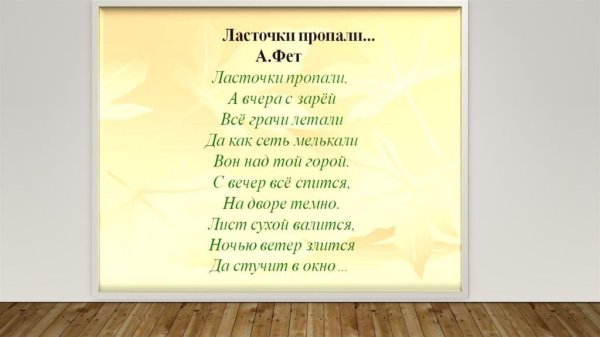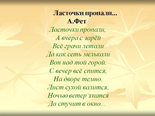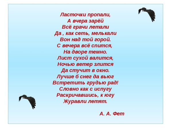 Иллюстрация к стиху "Фет ласточки пропали" является визуальным отражением темы и настроения данного произведения. Изображение может представлять собой мрачный пейзаж, символизирующий утрату и печаль, либо же контрастное изображение счастливых и свободных ласточек, подчеркивающее их исчезновение. Оно может быть выполнено в различных стилях и техниках - от реализма до абстракции, чтобы передать эмоциональную глубину стихотворения. Иллюстрация помогает зрителю или читателю еще сильнее ощутить и воспринять основные идеи и образы, заложенные в стихе Фета.