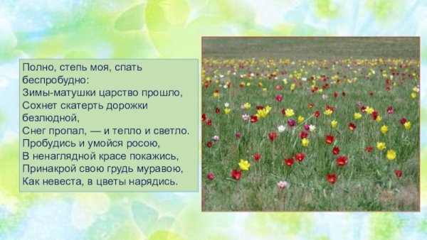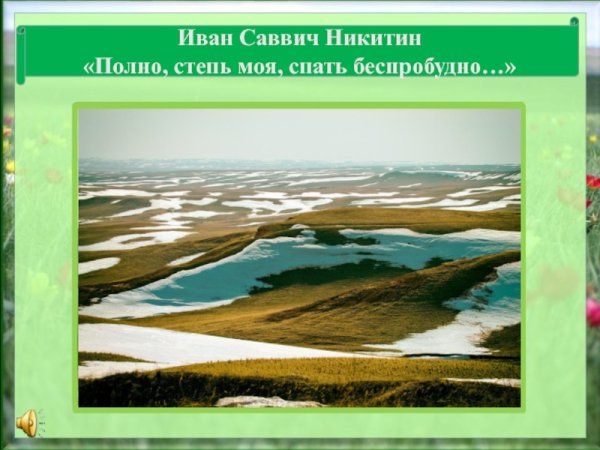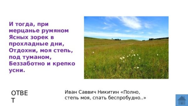 В моей иллюстрации к стиху "Полно степь моя спать беспробудно" я воплощаю ощущение бесконечной просторности и таинственности. Картина отражает обширные прерии, покрытые густым мхом и травой, которые стремятся захватить каждый уголок этого удивительного места. Вдали виднеются горизонтальные линии, создавая иллюзию бесконечности. Через небо проходят россыпи ярких звезд, их блеск добавляет магического сияния этой живописной сцене. Весь образ наполнен таинственностью и одновременно призывает к погружению в глубины своих мыслей и фантазий.