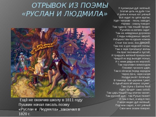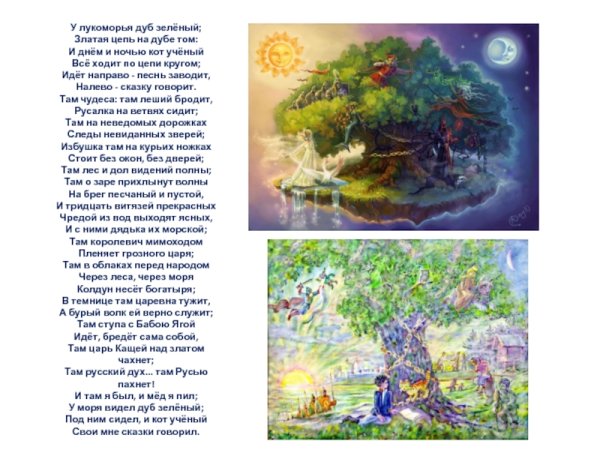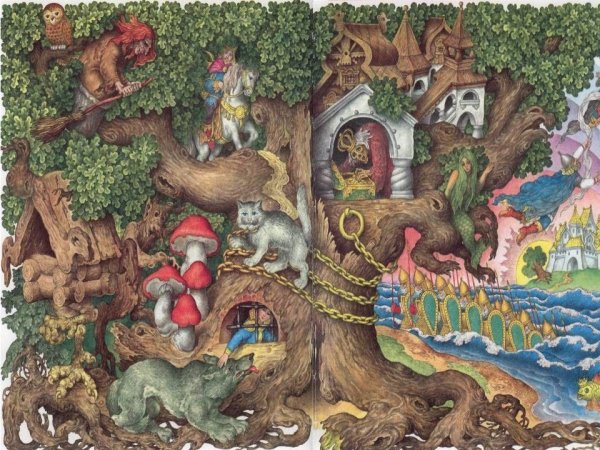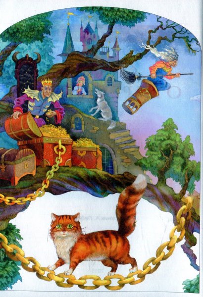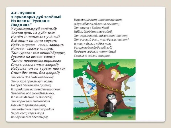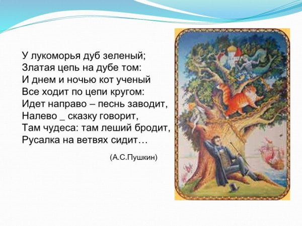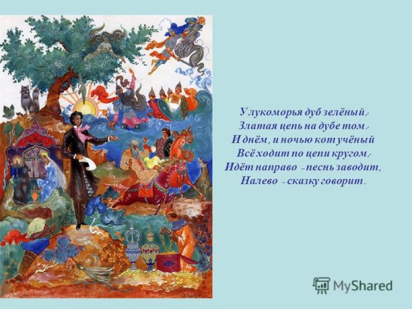 Великий русский поэт Александр Сергеевич Пушкин создал одно из самых известных стихотворений в истории литературы - "У лукоморья дуб зеленый". Эти слова вдохновили множество художников на создание иллюстраций, которые передают магию и загадочность этого места. На одной из таких иллюстраций можно увидеть дуб зеленый в окружении лесной чащи. Его ветви раскинуты в разные стороны, создавая тень, а листва отражает солнечный свет и ярко выделяется на фоне. Вокруг дуба простирается густой зеленый ковер травы, а вдалеке виднеется озеро с прозрачной водой. Эта иллюстрация передает волшебную атмосферу и загадочность места, о котором рассказывает Пушкин.