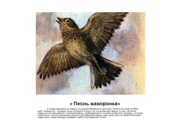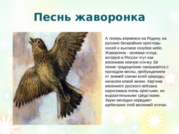 Иллюстрация к рассказу "Жаворонок Али Карнай" погружает нас в удивительный мир природы и неповторимую атмосферу жизни птиц. На картине можно увидеть маленького жаворонка по имени Али Карнай, который с легкостью парит в небе, исполняя свою прекрасную мелодию. Через иллюстрацию передается его энергия и радость, которые он испытывает, находясь в своем естественном элементе. Она также отражает нежность и красоту мироздания, напоминая о важности сохранения и уважения к природе. Иллюстрация к рассказу "Жаворонок Али Карнай" яркая и позитивная, вызывая у зрителя чувство восхищения и восторга перед силой и красотой природы.