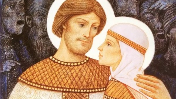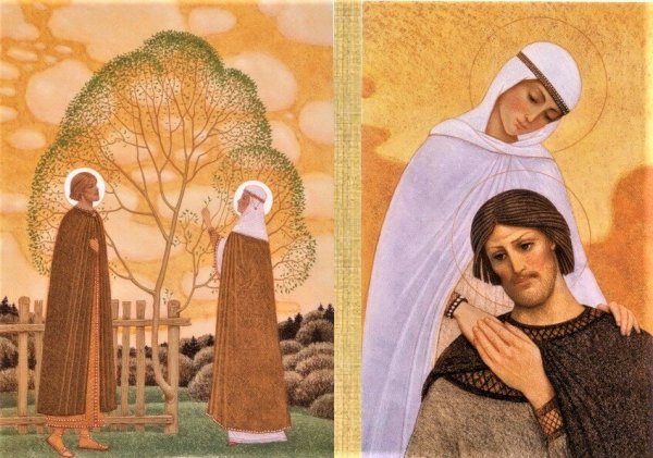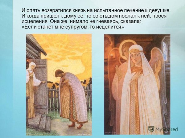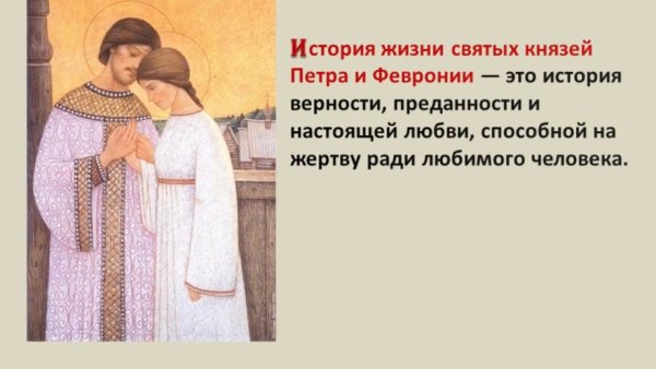 Иллюстрация к повести о Петре и Февронии Муромских - это великолепное произведение искусства, которое воплощает в себе всю красоту и романтику этой старинной легенды. Она передает нежность и любовь главных героев, а также их верность друг другу на протяжении всей жизни. Изображение Петра и Февронии, держащихся за руки, отражает их гармоничную связь и единство душ. Вдумчивые выражения лиц персонажей и детализированный фон создают образ, который заставляет зрителя погрузиться в историю и прочувствовать все эмоции, которые переживают герои. Эта иллюстрация является не только отличным элементом декора, но и символом истинной любви и преданности, который вдохновляет и приносит радость.