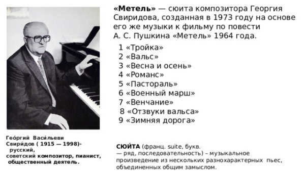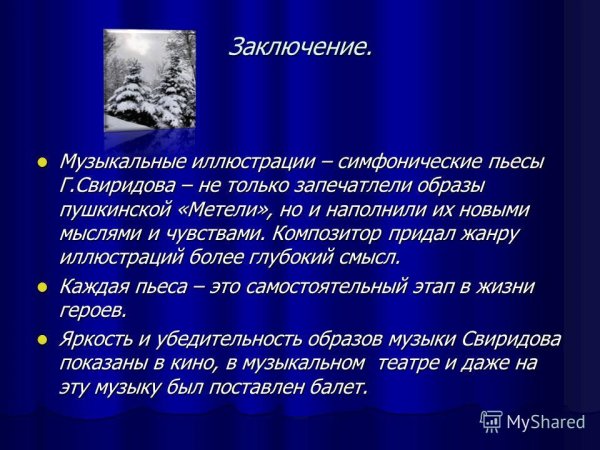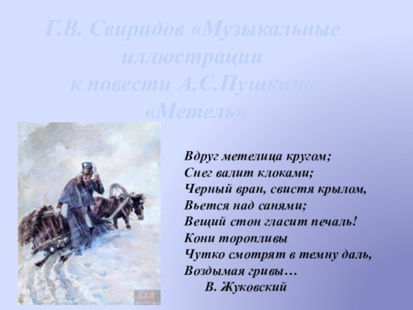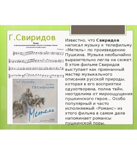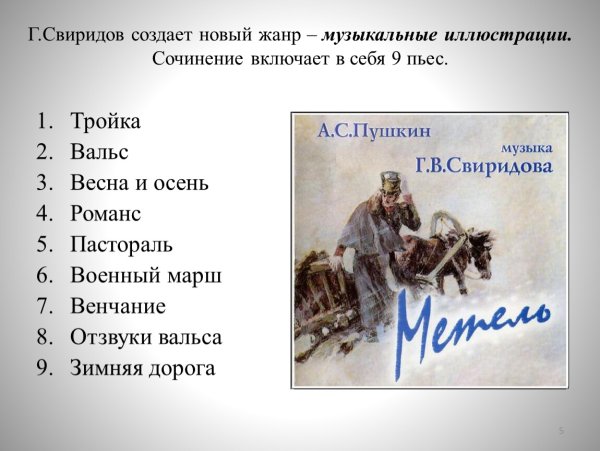 Композитор музыкальной иллюстрации к повести А.С. Пушкина "Метель" - творческая и вдохновенная личность, способная передать в нотах всю атмосферу и эмоциональное напряжение произведения. С его помощью зритель переносится в мир изображенных событий и переживаний героев, словно становится свидетелем самой метели. Музыкальная иллюстрация прекрасно подчеркивает настроение и драматическую силу повествования, позволяя читателю окунуться в сказочный и загадочный мир, созданный самим Пушкиным.