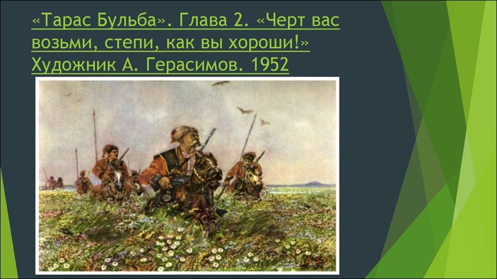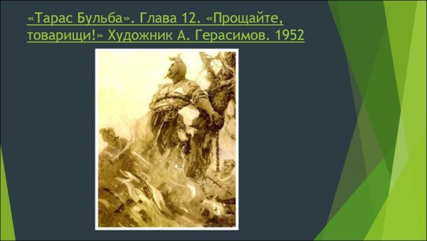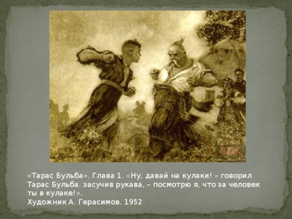 Иллюстрации А.М. Герасимова к повести "Тарас Бульба" великолепно передают атмосферу и сюжет произведения. Каждая иллюстрация дополняет текст, помогая читателю более оживленно представить события и персонажей. Художник мастерски воспроизвел яркие эпизоды из повести, отразив на картине мощные и страстные характеры украинских казаков, гордость и душевную борьбу Тараса Бульбы, а также атмосферу казачьего быта и войны. Иллюстрации А.М. Герасимова стали неотъемлемой частью этого знаменитого произведения и придают дополнительную глубину и выразительность его сюжету.