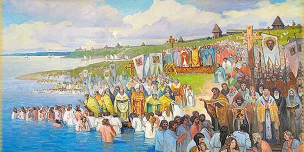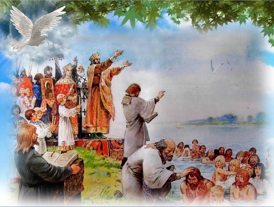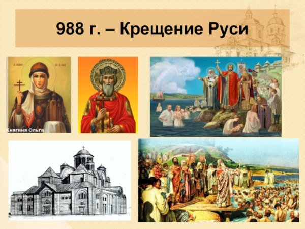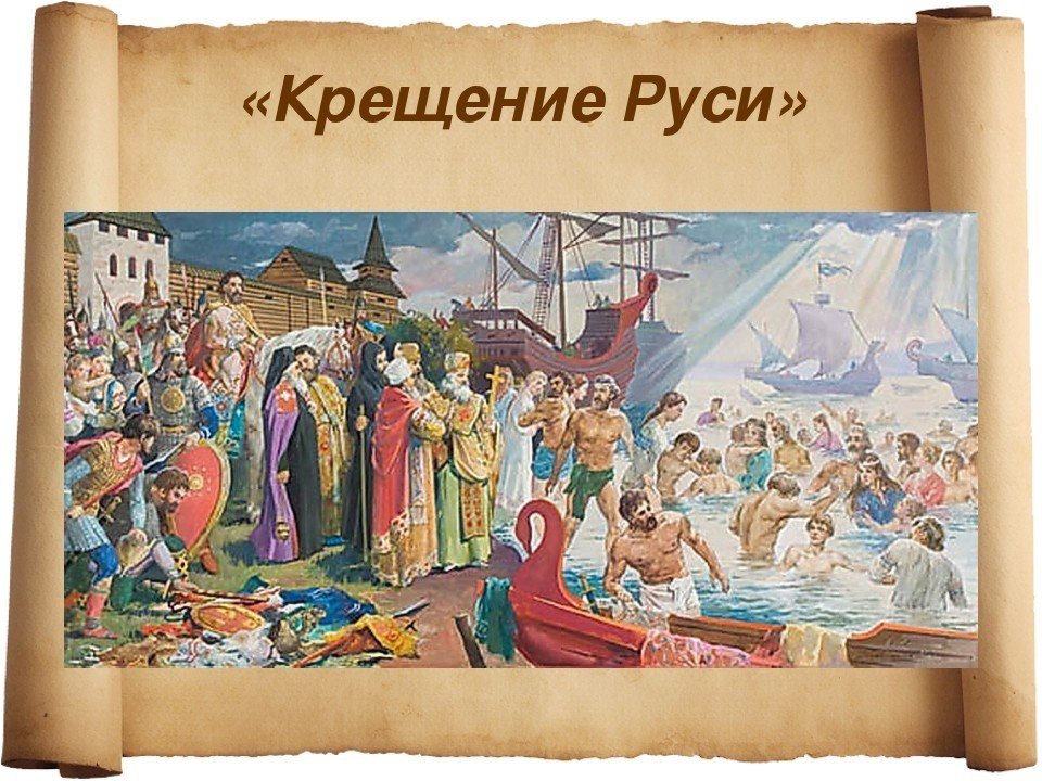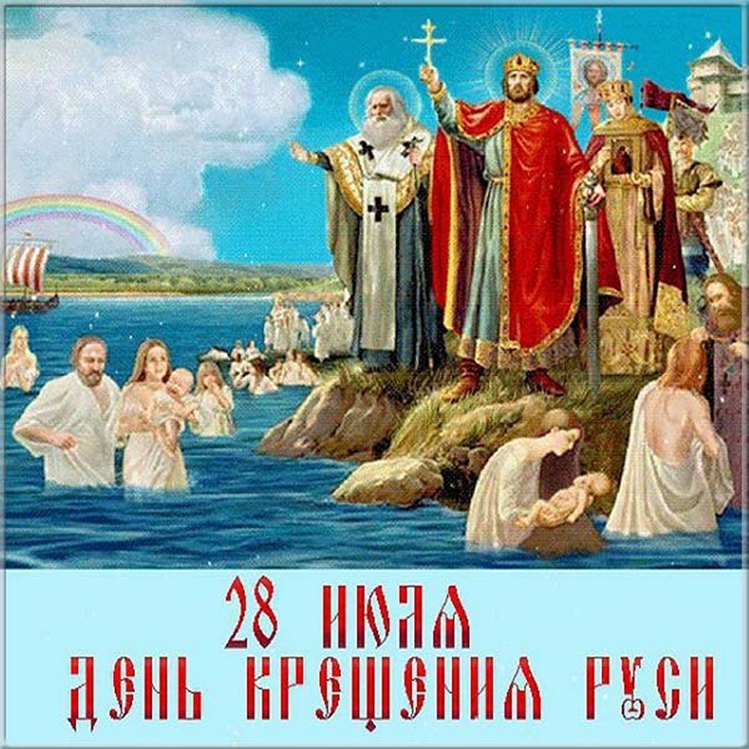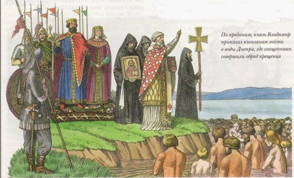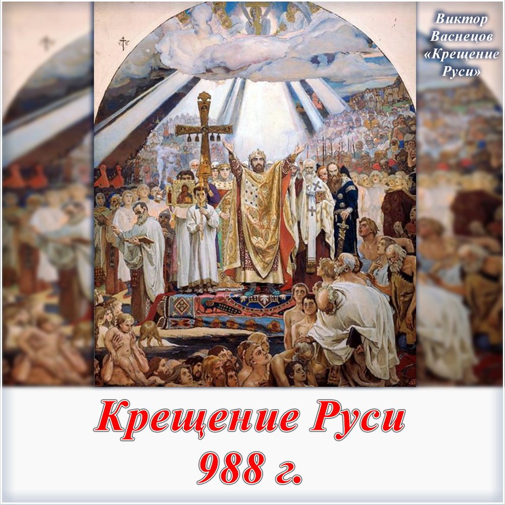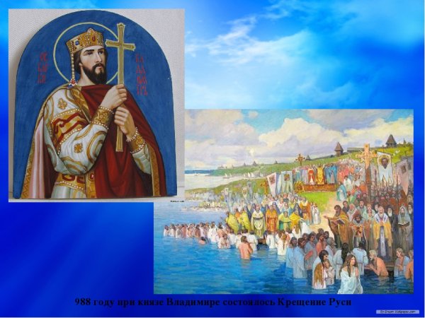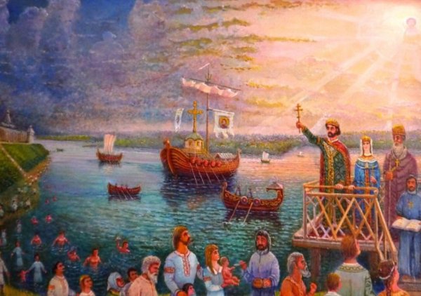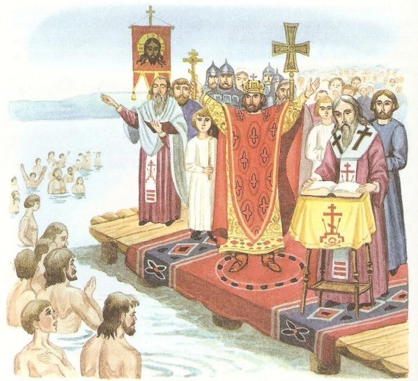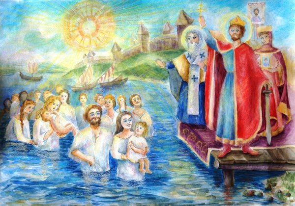 Иллюстрация "Крещение Руси" является изображением исторического события, имеющего огромное значение для формирования и развития Русской православной церкви и культуры России в целом. На этой иллюстрации можно увидеть момент крещения русских князей Владимира Святославича и его бояр на реке Днепр в 988 году. Главным героем изображения является сам князь Владимир, окруженный свитой и духовными лицами. Они предстают перед образом Иоанна Крестителя, который крестит их, погружая воду в реке. Иллюстрация воплощает символику крещения, а также отражает духовные истоки и христианскую веру, которые стали основой для будущего развития Руси.