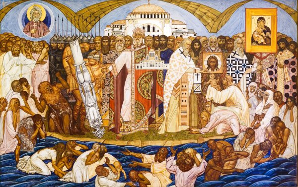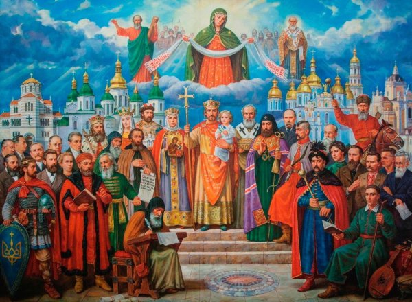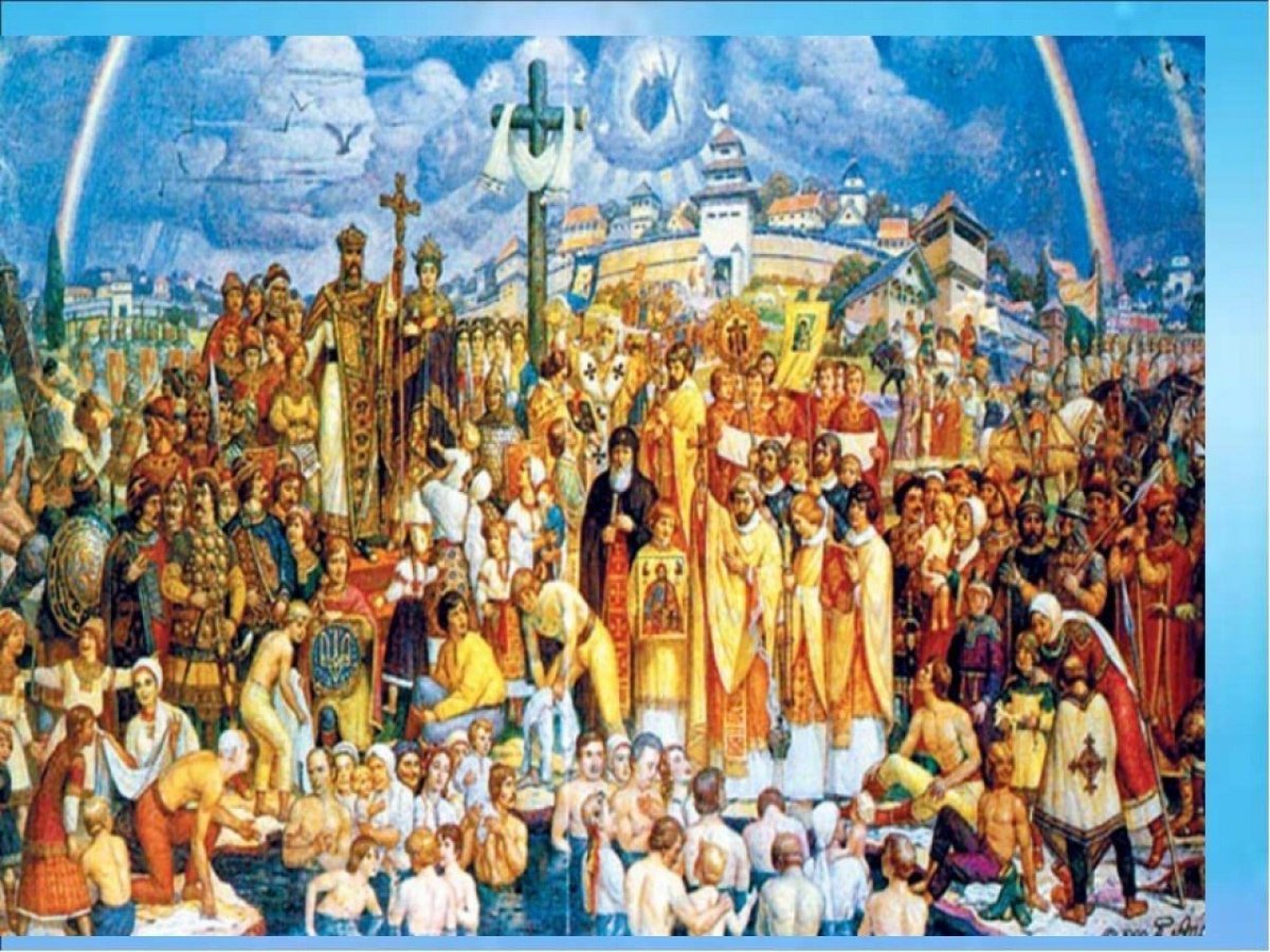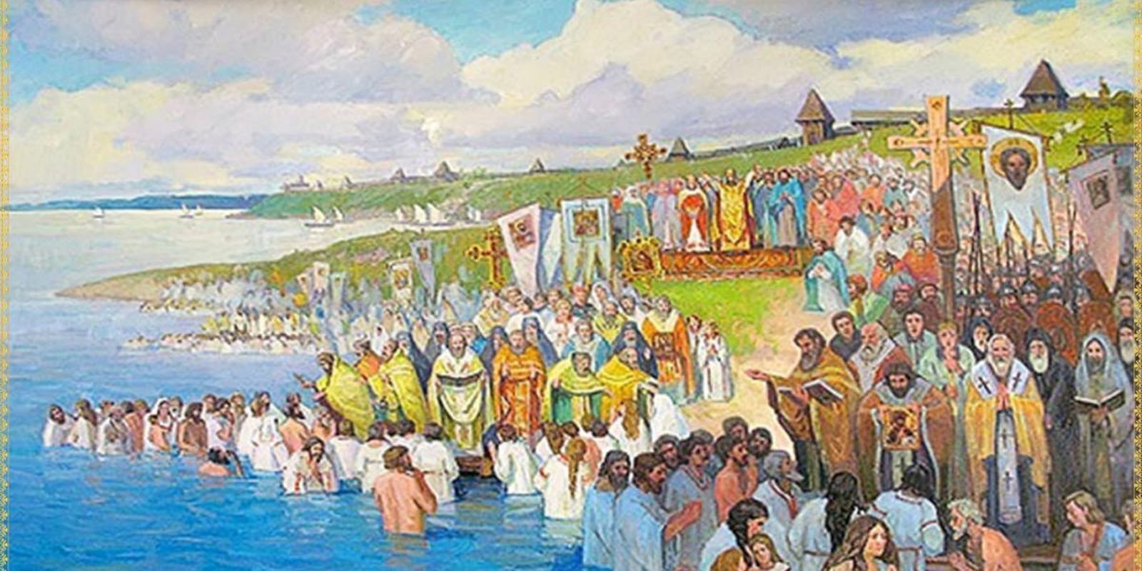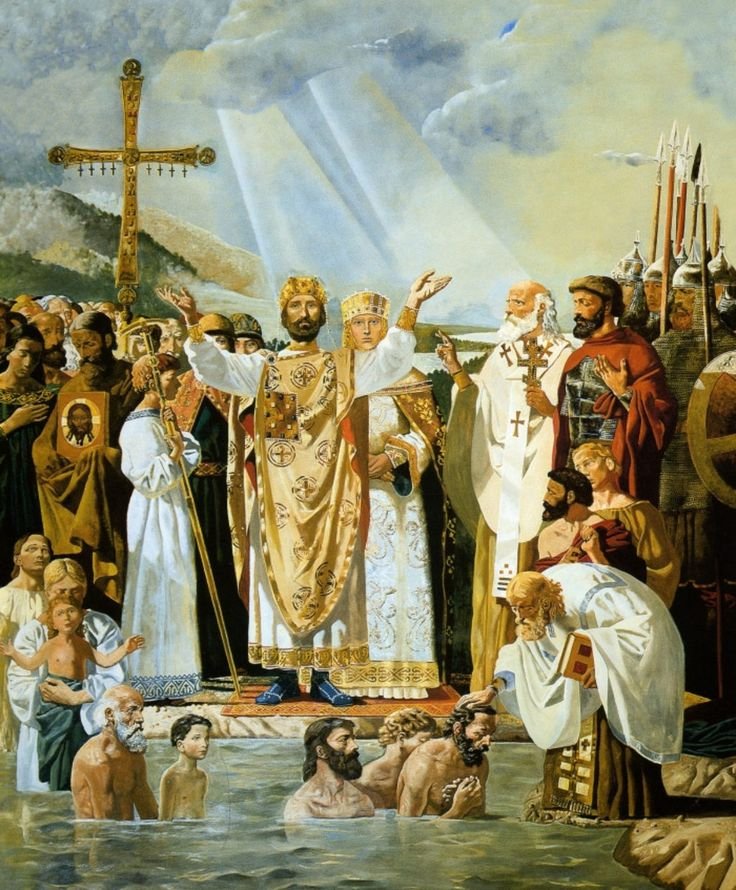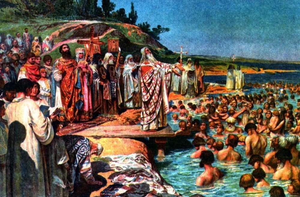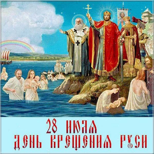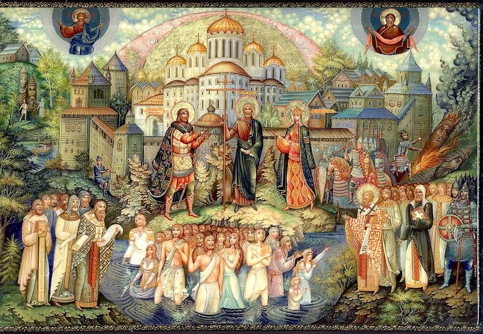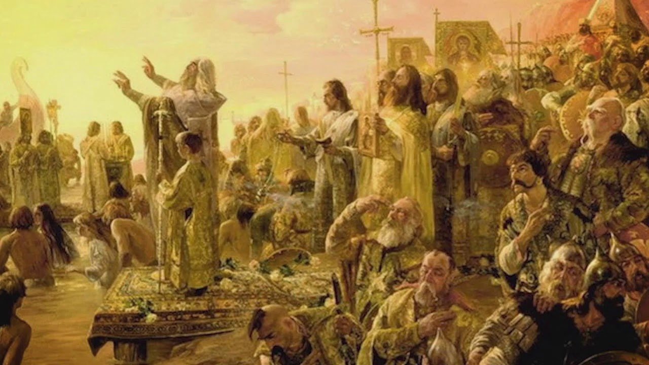 Иллюстрация "Крещение Руси" является изображением исторического события, имеющего огромное значение для формирования и развития Русской православной церкви и культуры России в целом. На этой иллюстрации можно увидеть момент крещения русских князей Владимира Святославича и его бояр на реке Днепр в 988 году. Главным героем изображения является сам князь Владимир, окруженный свитой и духовными лицами. Они предстают перед образом Иоанна Крестителя, который крестит их, погружая воду в реке. Иллюстрация воплощает символику крещения, а также отражает духовные истоки и христианскую веру, которые стали основой для будущего развития Руси.