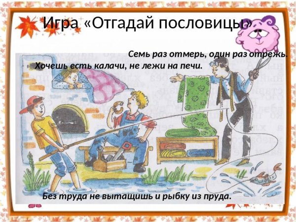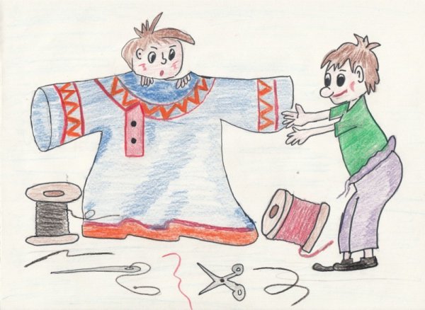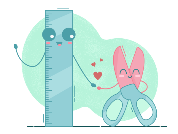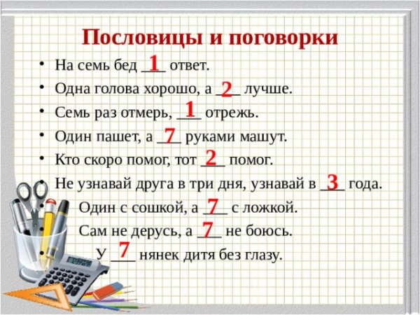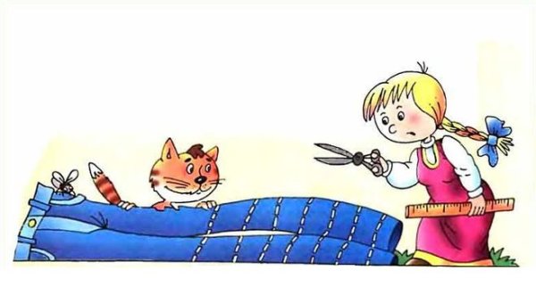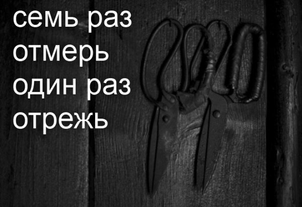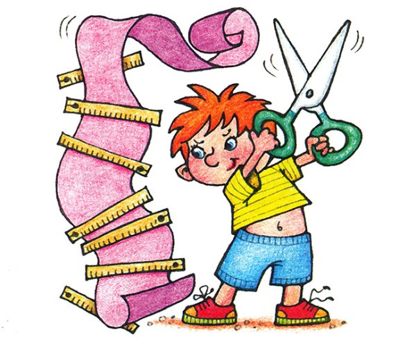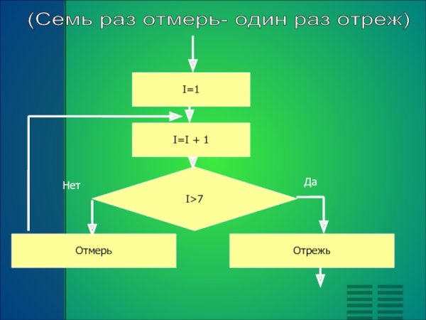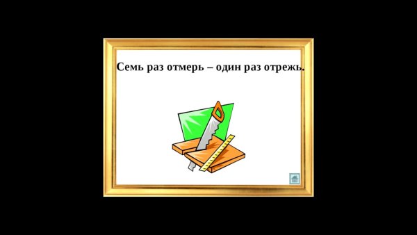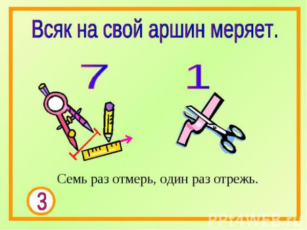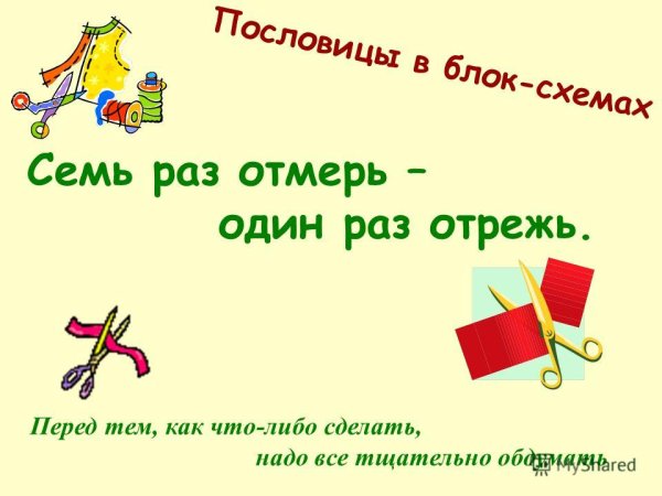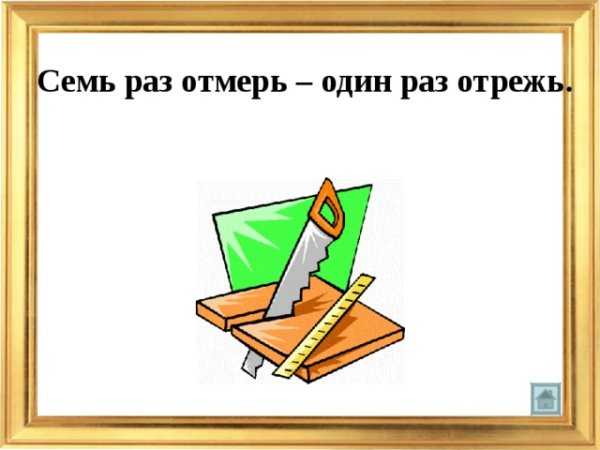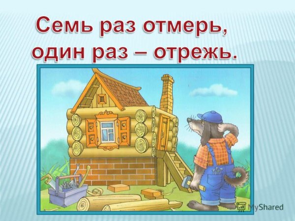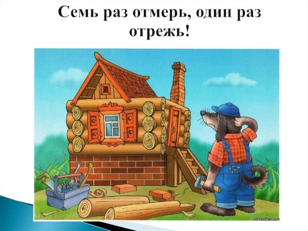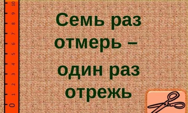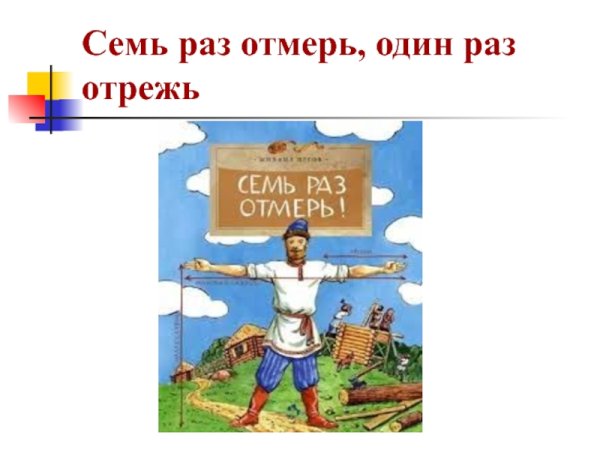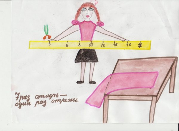 На иллюстрации видно, как человек стоит перед столом, на котором лежат различные предметы. Его рука протянута к ножу, который лежит рядом с другими инструментами. Взгляд человека направлен на предмет, который он собирается отрезать. На заднем плане можно увидеть семь отмеренных кусков, которые были правильно подготовлены заранее. Иллюстрация является наглядным образом пословицы "Семь раз отмерь, один раз отрежь", в которой советуется внимательно и тщательно продумывать свои действия, чтобы избежать ошибок и неудач.