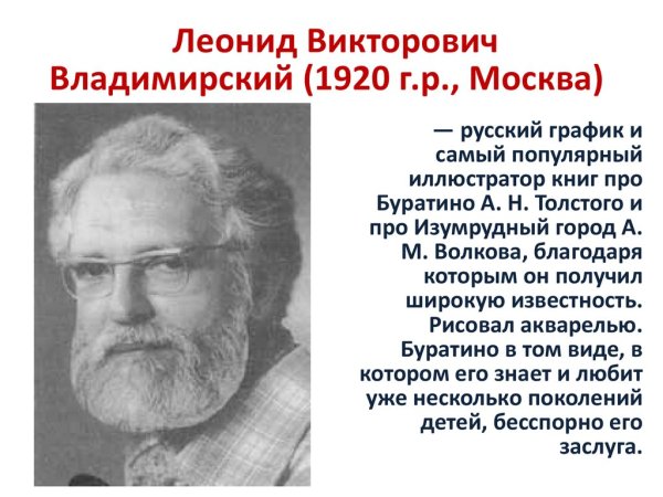Леонид Викторович Владимирский - талантливый и известный художник-иллюстратор, чьи работы удивляют своей красотой и оригинальностью. Каждая его иллюстрация - это настоящее произведение искусства, которое умело передает настроение и суть текста, книги или журнала, которые он иллюстрирует. Благодаря своему уникальному стилю и мастерству, Леонид Владимирский создает волшебные образы, которые захватывают воображение зрителя и окружают его атмосферой загадки и фантазии. Его иллюстрации всегда вызывают интерес и восхищение, делая произведения еще более привлекательными для читателей и поклонников искусства.