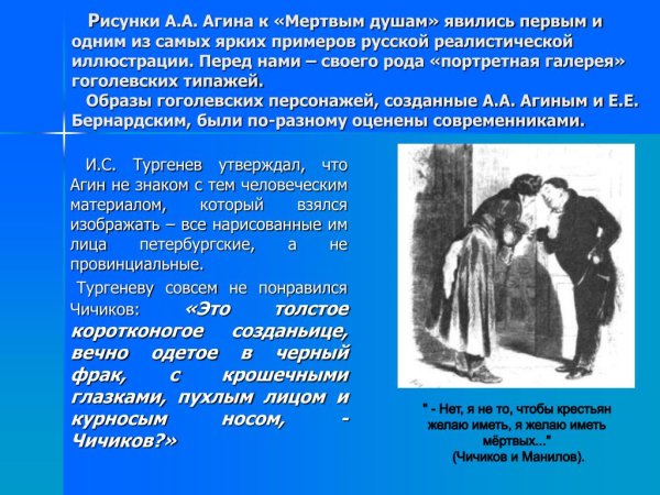 Иллюстрации Агина к "Мертвым душам" Николая Гоголя - это визуальное дополнение к знаменитому роману, которое помогает читателю глубже погрузиться в мир произведения. Агин, известный русский художник-иллюстратор, передал в своих работах основные темы и настроение романа, создавая неповторимую атмосферу. Его иллюстрации оживляют персонажей и события, позволяя зрительно представить себе умилительных оборотней, живописные пейзажи и загадочную атмосферу 19 века. Каждая деталь, каждый мазок на его работах аккуратно проработаны, чтобы передать эмоции и дух оригинального произведения. Иллюстрации Агина к "Мертвым душам" - это настоящее искусство, которое помогает оживить классическую литературу и углубить понимание ее смысла.