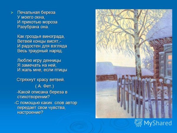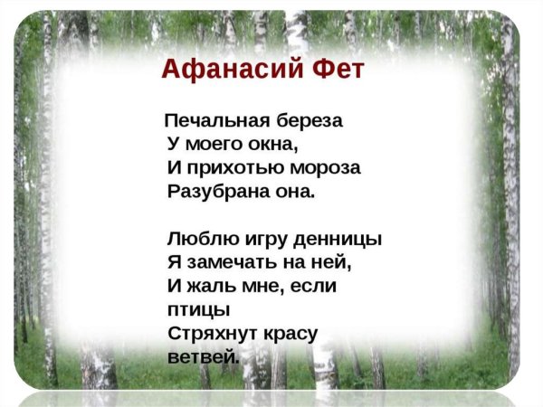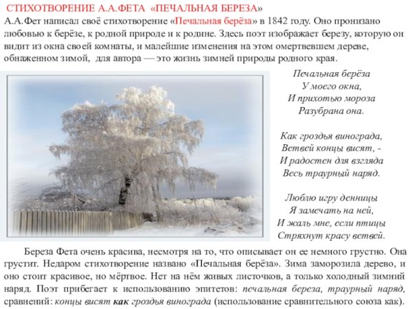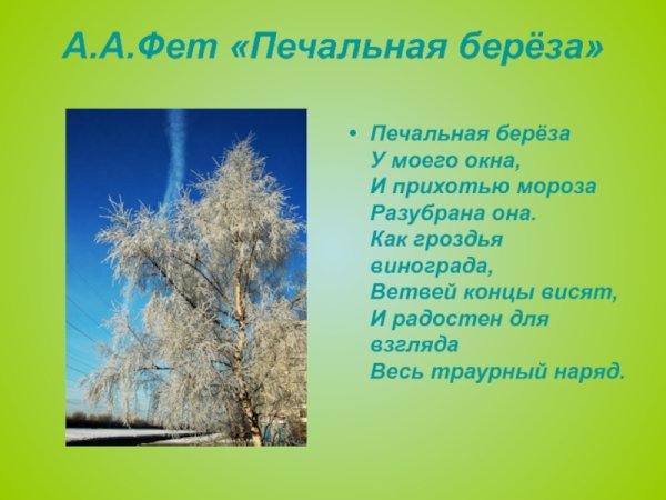 Печальная береза - фет, иллюстрация уносит нас в мир нежности и меланхолии. Ее изящные ветки покрыты легким слоем снега, а грустный взгляд ее листвы отражает тоску и утрату. Фетовская иллюстрация передает волнующие эмоции и создает особую атмосферу, перенося нас в прекрасный мир природы, где даже самые грустные моменты обретают свою красоту и глубину. Она станет прекрасным украшением интерьера, наполнив его тонким и гармоничным настроением, и будет напоминать о важности присутствия в каждом мгновении жизни.