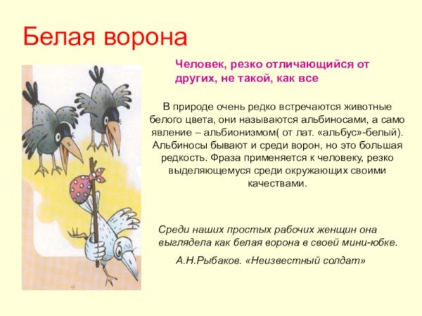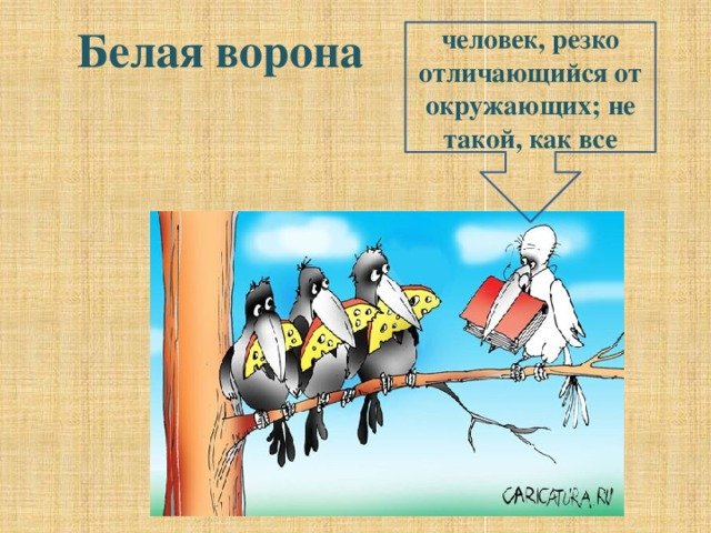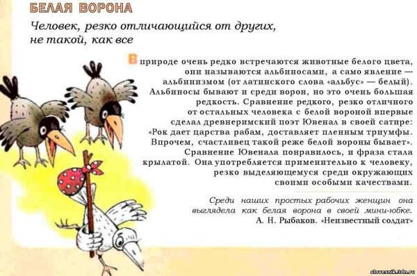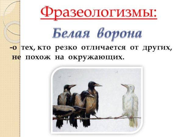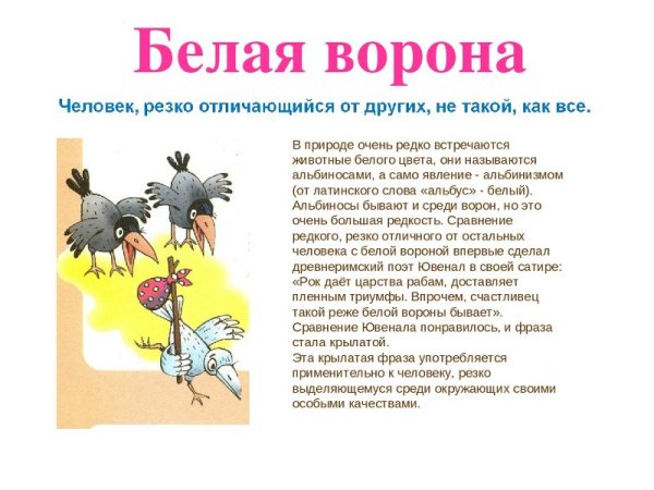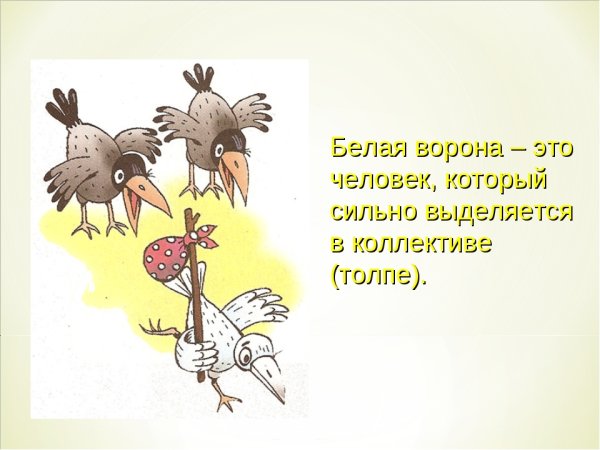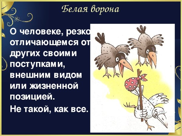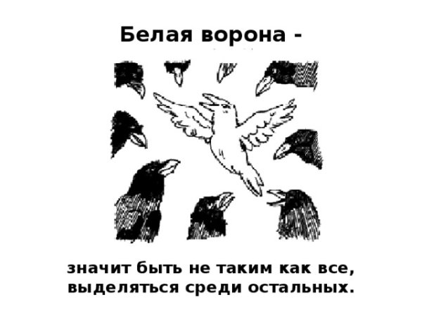 Фразеологизм "белая ворона" используется для описания человека, который отличается от остальных своими редкими качествами или особыми чертами. Как и настоящая белая ворона, такой человек выделяется из толпы, будучи уникальным и неповторимым. Он может быть необычайно талантливым, интеллектуально развитым или иметь особую харизму, которая привлекает внимание окружающих. В то же время, фразеологизм "белая ворона" подразумевает, что такие люди могут испытывать сложности в социальном адаптировании, так как их отличительные особенности могут вызывать недоумение или зависть. Независимо от этого, белые вороны являются ценным активом общества, способными принести новые идеи и взгляды, а также вдохновить других на интеллектуальное или творческое развитие.