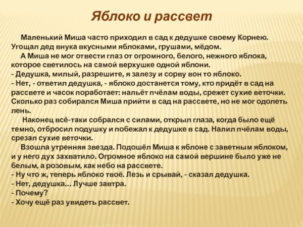 Иллюстрации "Сухомлинский яблоко и рассвет" - это великолепное сочетание изображений, которые передают нам красоту и нежность утра. На этих иллюстрациях вы можете увидеть яблоки, окутанные тонкой дымкой рассвета, их сочный цвет и привлекательный вид вызывает желание сорвать их прямо с ветки. Весь образ наполнен светом и теплом, что создает атмосферу умиротворения и приятных ощущений. Эти иллюстрации позволяют окунуться в мир природы и насладиться ее красотой и простотой.