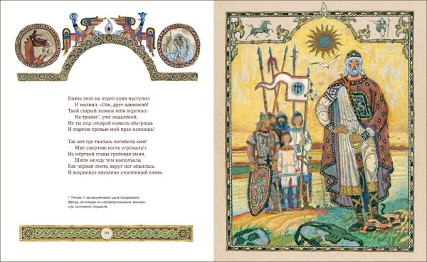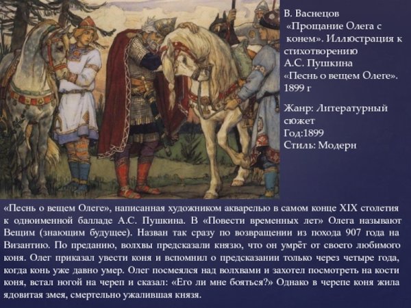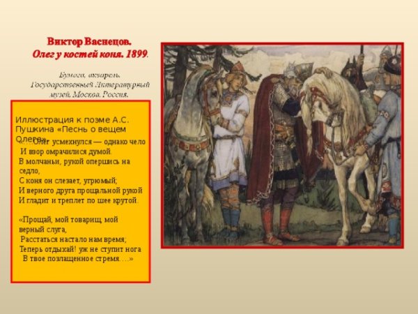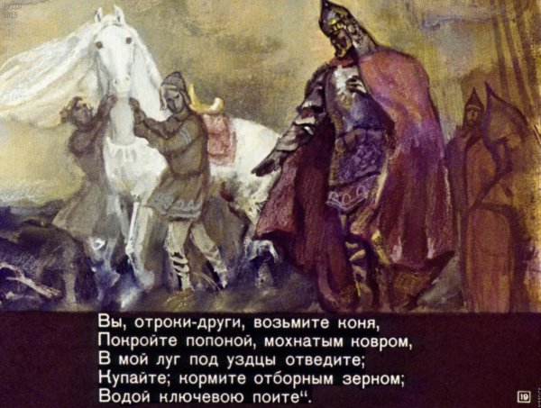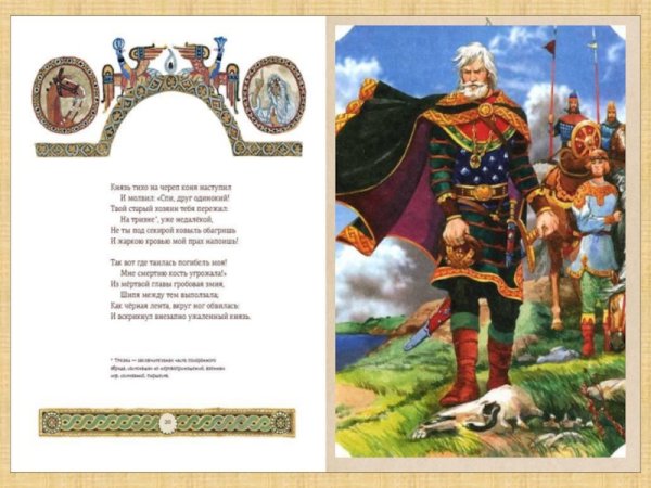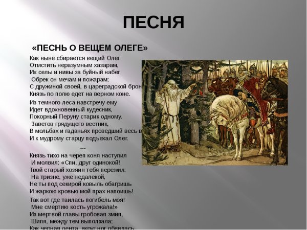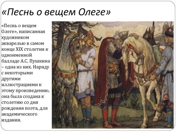 Иллюстрации к песне "О вещем Олеге" Пушкина - это яркие и захватывающие изображения, которые оживляют и дополняют текст этой знаменитой песни. Они передают атмосферу и эмоции, присутствующие в стихотворении, и помогают читателю или слушателю еще глубже погрузиться в мир средневековой Руси и легендарного героя Олега. Иллюстрации могут отображать различные сцены из жизни Олега: его битвы, путешествия, встречи с другими героями, а также символические образы, связанные с его характером и подвигами. Каждая иллюстрация вносит свой вклад в общую картину произведения, помогая читателю более полно представить себе события и переживания главного героя.