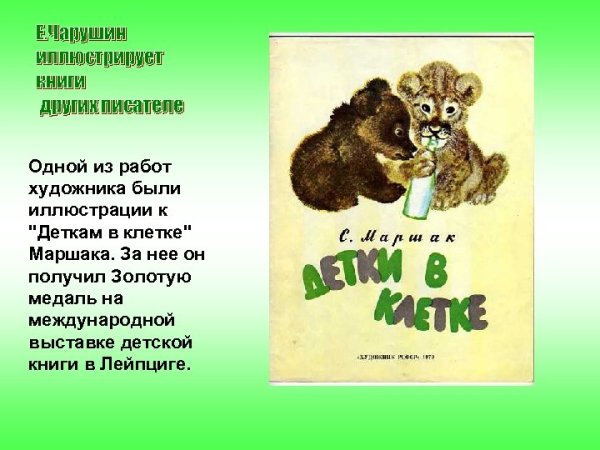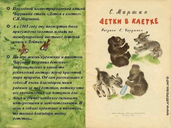Погрузитесь в мир удивительных иллюстраций Чарушина, которые оживляют детские фантазии. Через его талантливый почерк иллюстрации превращаются в настоящие произведения искусства. Каждая деталь задумана до мельчайших нюансов, чтобы создать гармоничное и волшебное окружение для деток. Их жизнерадостные лица, выразительные глазки и яркие краски привлекут внимание ребят и заставят их улыбаться. Помещенные в клетку, эти милые персонажи словно оживают на странице, и ваш ребенок сможет погрузиться в увлекательный мир приключений и игр. Откройте своему малышу возможность открыть новый мир через иллюстрации Чарушина!