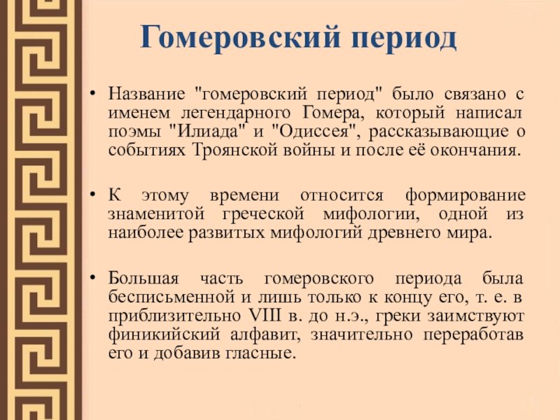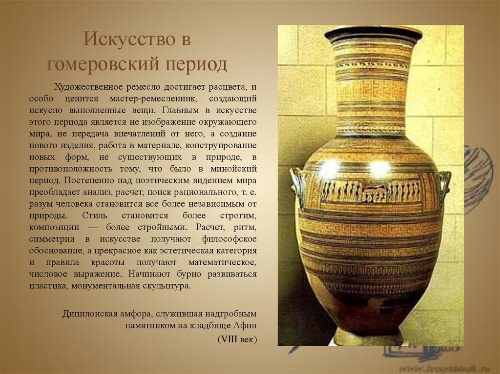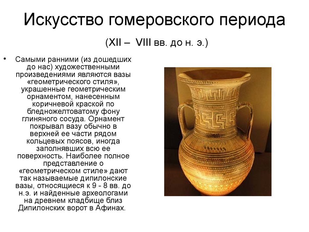 Живопись гомеровского периода является одним из наиболее значительных и влиятельных этапов в развитии древнегреческого искусства. В это время художники стремились передать эпическую мощь и героизм, присущие гомеровским поэмам. Основные темы живописи данного периода связаны с мифологией, битвами и сценами из жизни древних греков. Характерной чертой художественного стиля является простота и выразительность, а также использование ярких и контрастных цветов. Изображения часто отличаются ясными композиционными решениями и умелым использованием светотени для создания объема. Живопись гомеровского периода оставила незабываемый след в истории искусства и продолжает вдохновлять и восхищать людей своей красотой и силой выражения.