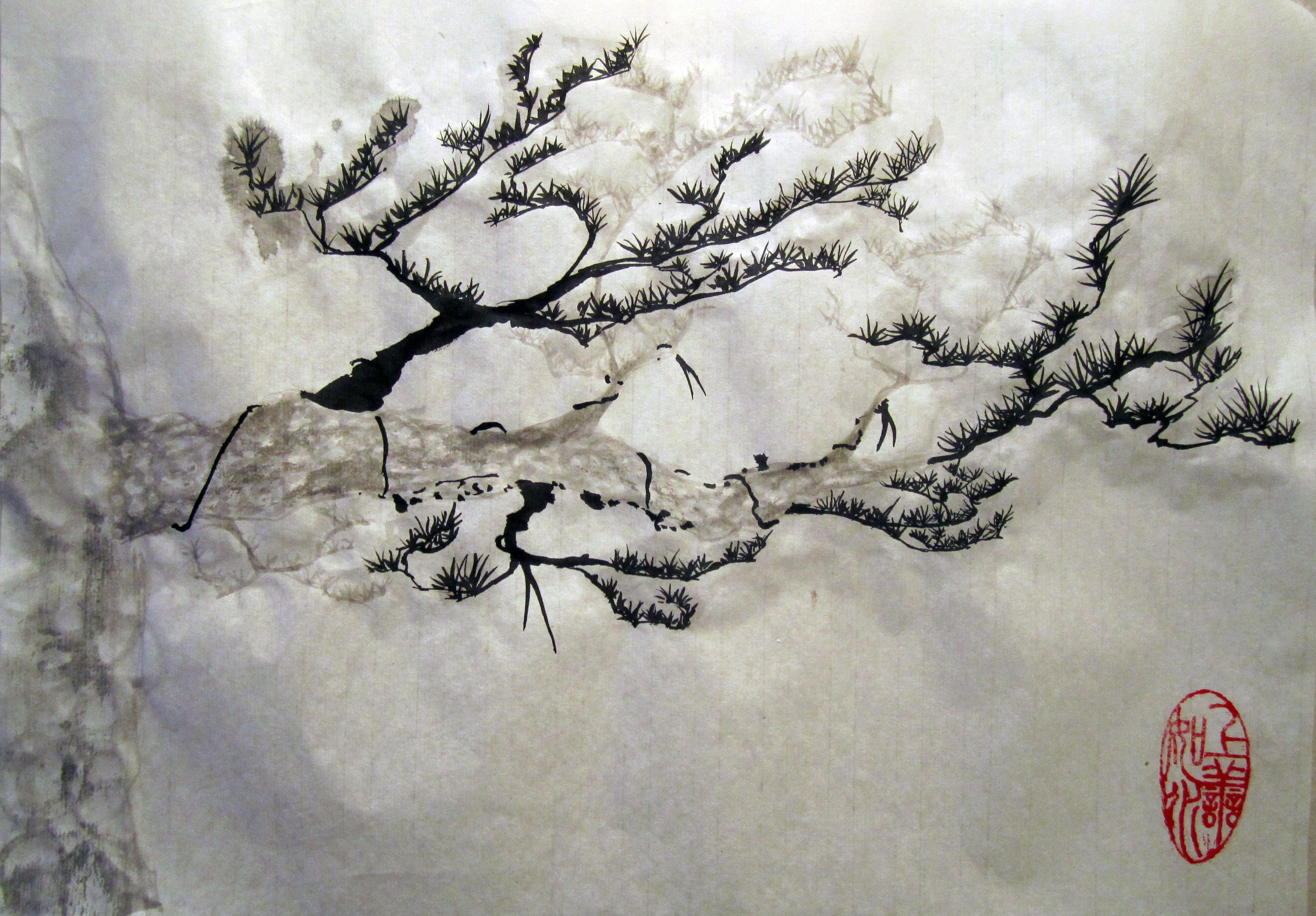 Японская живопись Суми-э сосна