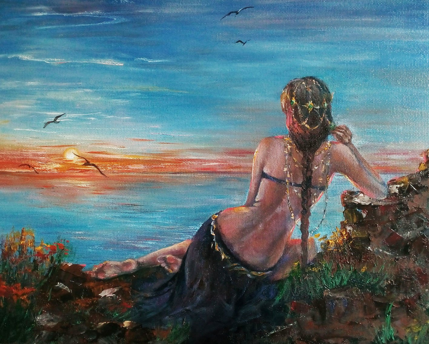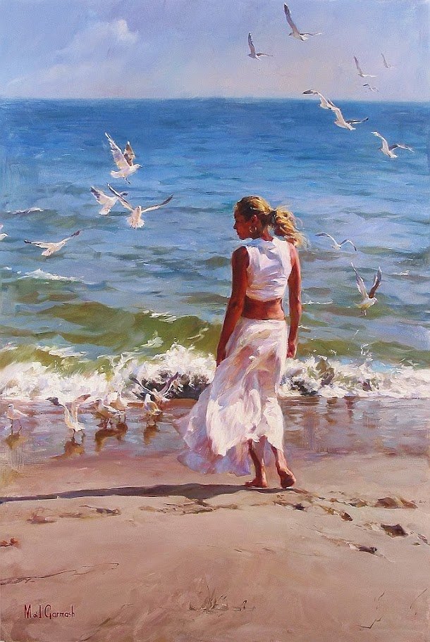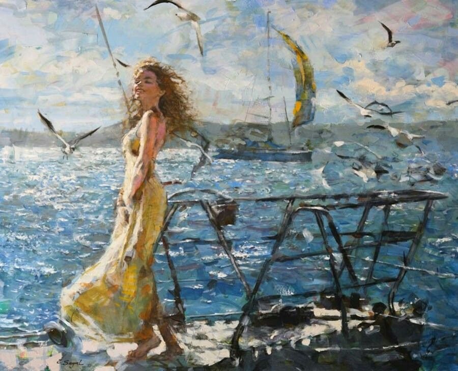 Живопись девушка у моря, Чайки
