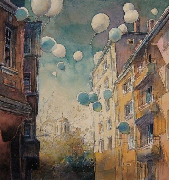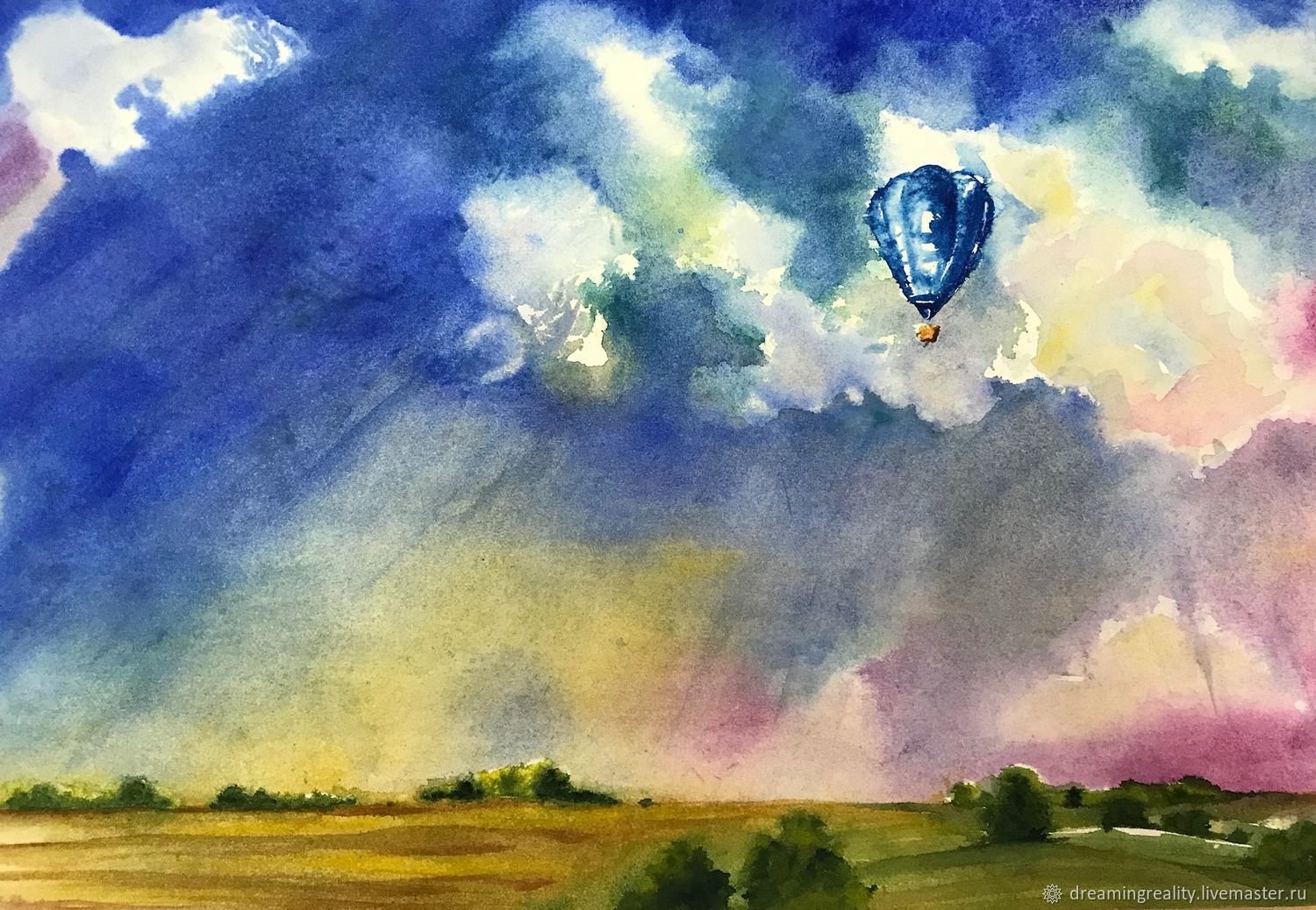 Пейзаж с воздушным шаром акварелью