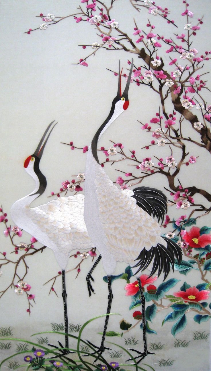 Вышивка с журавлями в японском стиле