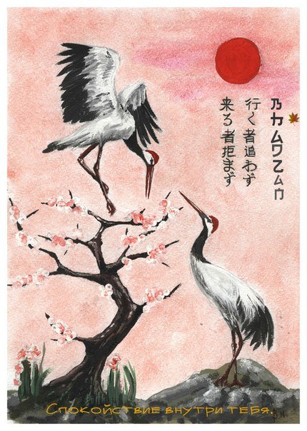 Японская живопись журавли и сакура (48 фото)