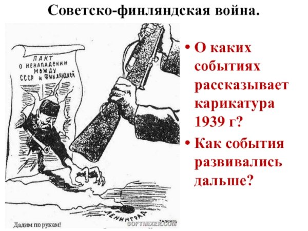 Советско-финская война, также известная как "Зимняя война", произошла в 1939-1940 годах и стала одним из наиболее заметных событий Второй мировой войны. Это был конфликт между СССР и Финляндией, вызванный территориальными претензиями со стороны советского правительства. В течение этой войны карикатуры стали одним из способов информирования и развлечения для солдат и граждан обеих сторон. Карикатуры изображали политические лидеров, сатирически комментировали текущие события и отражали настроения военного времени. Было создано множество ярких и запоминающихся карикатур, которые до сих пор остаются интересным источником для изучения этого периода истории.