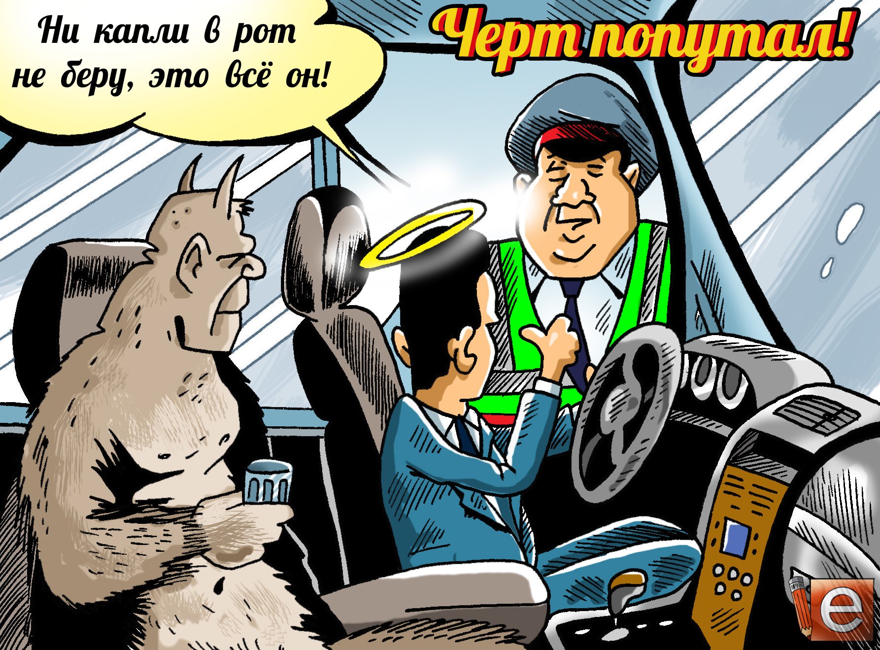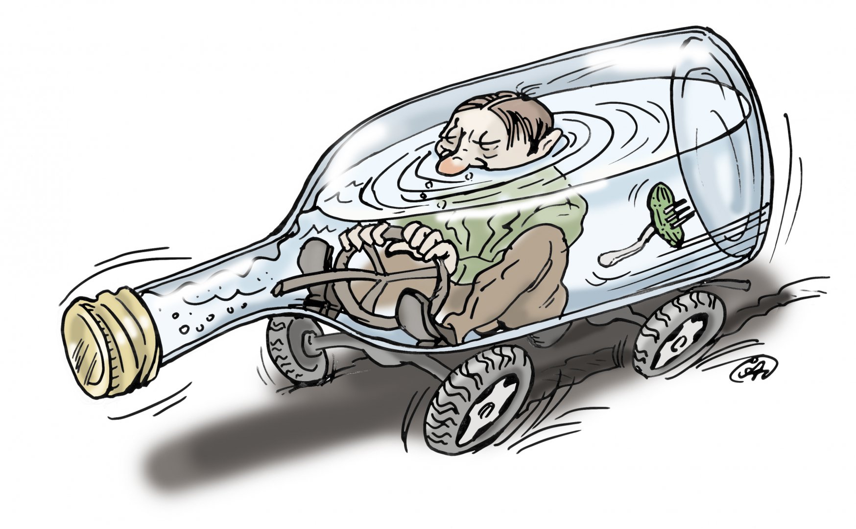 Карикатура "Пьяный водитель за рулем" ярко и сатирично отображает опасность, которую представляют пьяные водители на дорогах. Визуальное изображение пьяного водителя за рулем автомобиля наглядно передает безответственность, неадекватность и потенциально опасное поведение таких людей. Используя юмористический подход, карикатура призывает общество принять более серьезное отношение к проблеме пьяного вождения и напоминает о необходимости соблюдать правила дорожного движения и быть ответственными за свои действия за рулем.