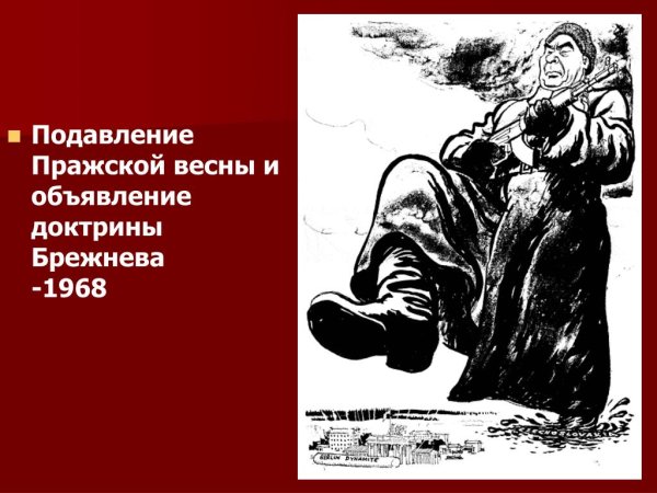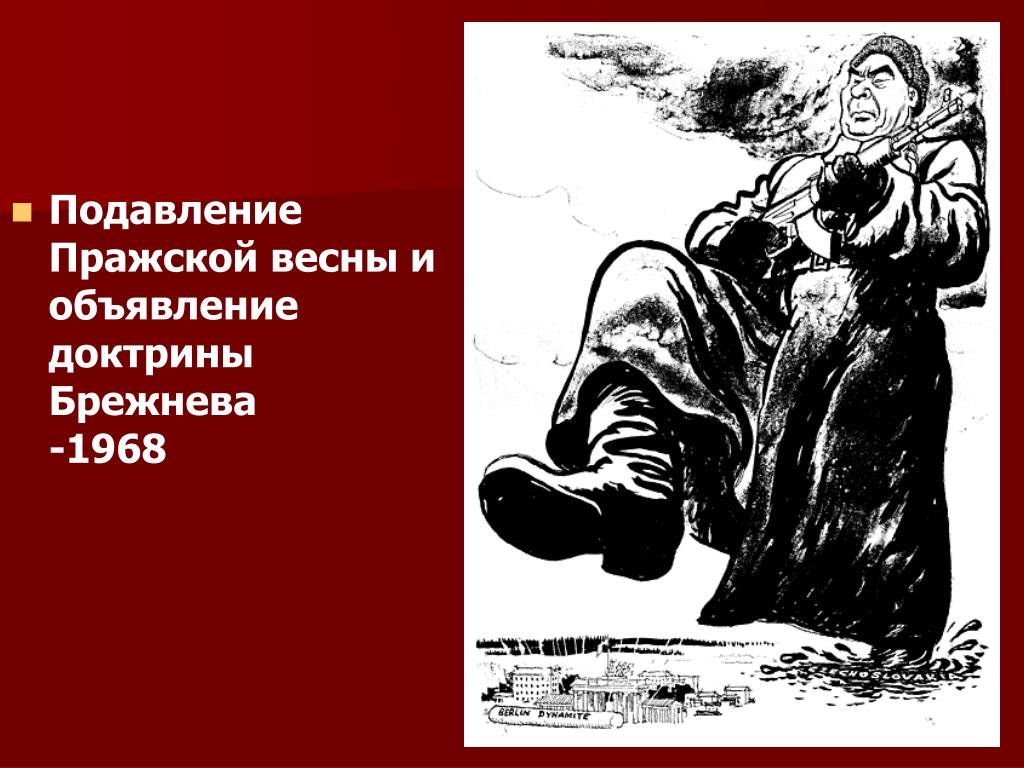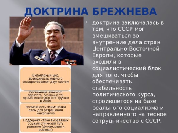 Доктрина Брежнева — это политическая стратегия, которая была разработана во времена правления Леонида Брежнева, генерального секретаря Центрального комитета Коммунистической партии Советского Союза. Название "доктрина" отражает систему принципов и подходов, которые определяли внешнюю политику СССР в эпоху Брежнева. Однако, часто использование этого термина может вызывать негативные ассоциации, особенно в контексте западной пропаганды. В связи с этим, некоторые историки и политологи используют фразу "доктрина Брежнева" как карикатурное выражение для описания политики консерватизма и жесткости, которую применял режим Брежнева.